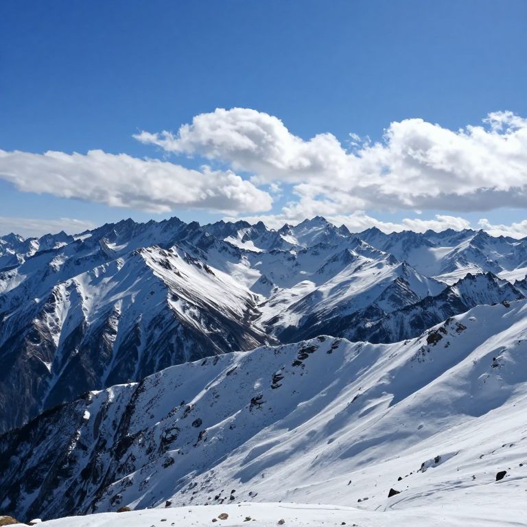 Snow-covered peaks rise majestically against a clear blue sky, their jagged silhouettes piercing through fluffy white clouds as rugged mountain ranges stretch endlessly into the horizon.