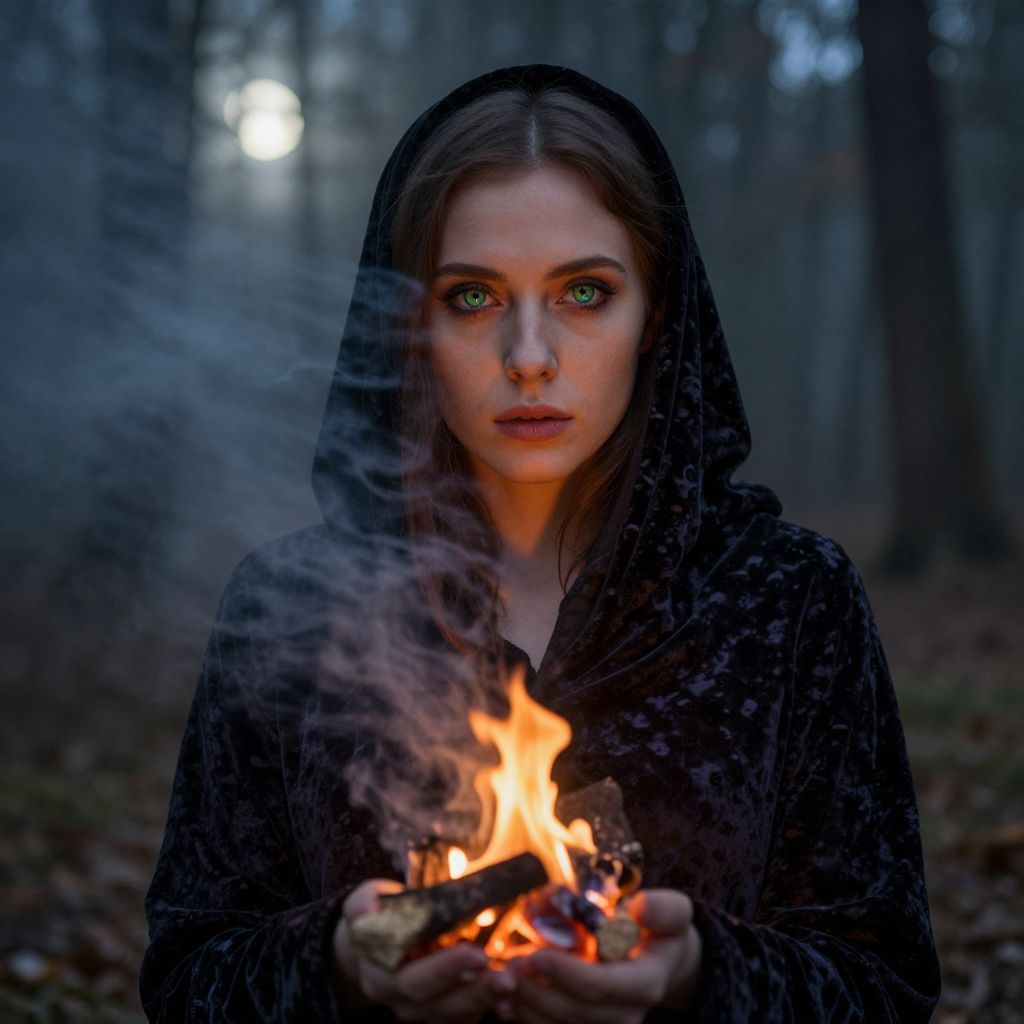 Photograph of a young woman with piercing green eyes, wearing a black hooded cloak, holding a fire in a dark, misty forest.