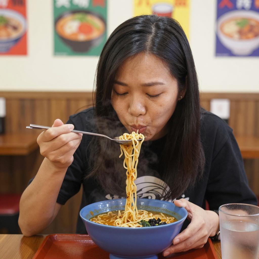 Asian woman with black hair in a ponytail, wearing a light pink button-up shirt, sitting at a table in a restaurant. She holds chopsticks in both hands, eating from a white bowl. Chopsticks are in her right hand, bowl in her left. Table has a glass of water, small red sauce bottle, and white dish. Background has blue chairs, wooden doors, and hanging lights. Blurred background indicates depth of field.