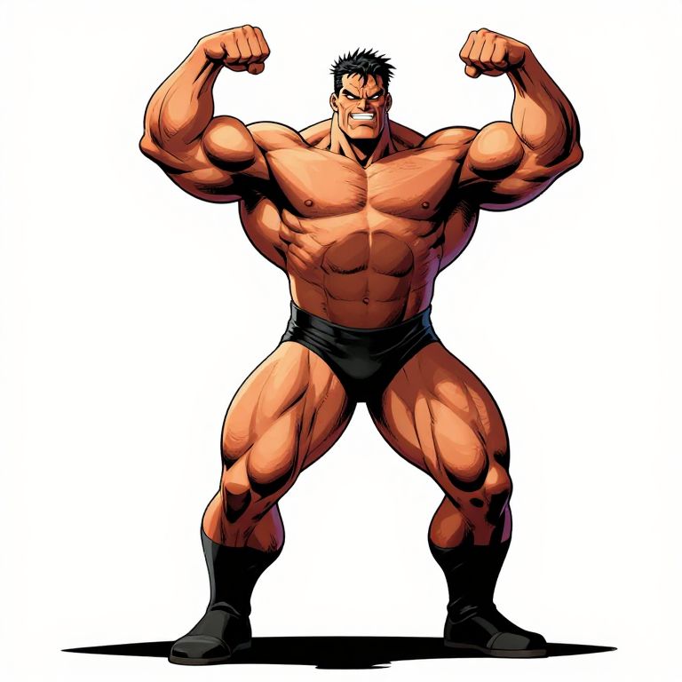 300 lbs bodybuilder posing in an epic comic book style, exaggerated muscular physique, vibrant colors, powerful stance, dramatic shadows, high detail