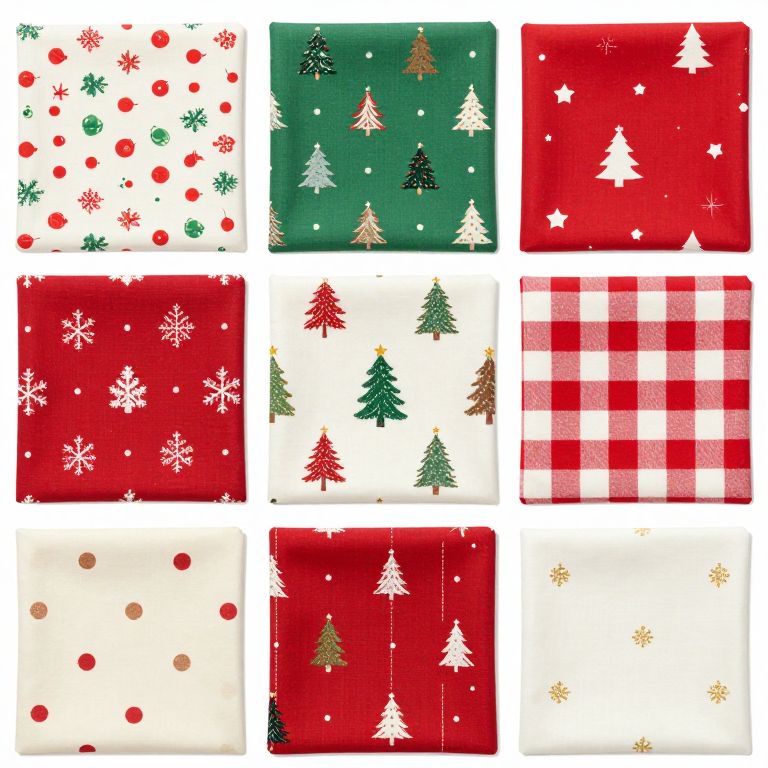 Photograph of nine Christmas fabric squares in red, green, white, and plaid patterns, featuring snowflakes, trees, and circles, arranged