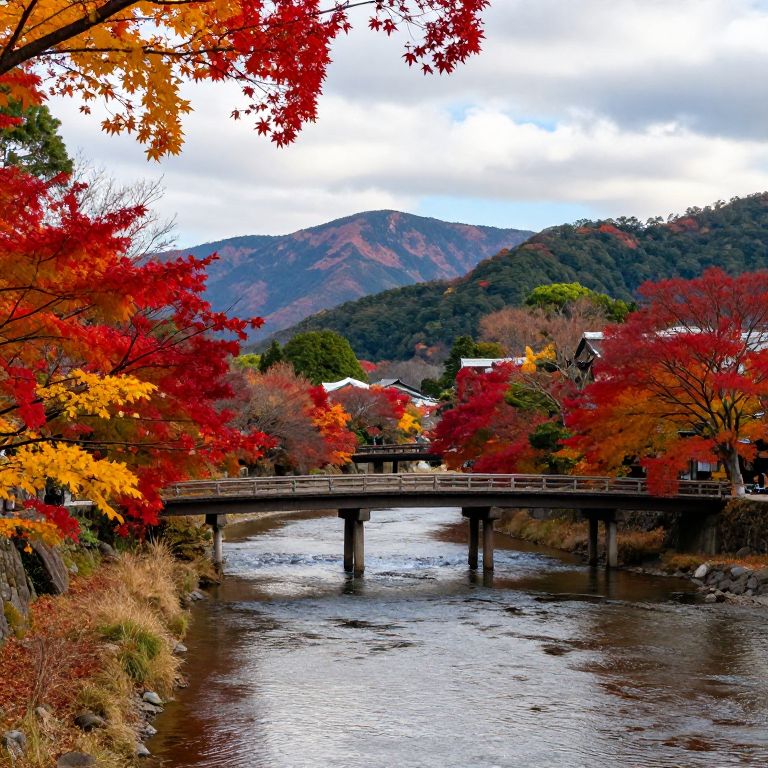 Autumn's vibrant tapestry unfolds along the serene Arashiyama River, where fiery red and golden leaves frame a tranquil bridge, nestled between majestic mountains and lush greenery under a soft, cloud-dotted sky.