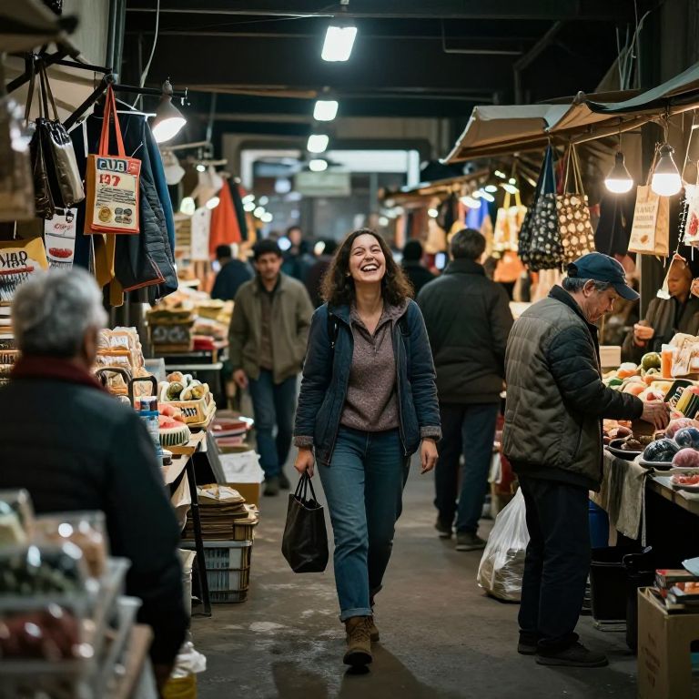Photograph of a bustling indoor market. A smiling woman with medium-length brown hair, wearing a dark blue jacket, pink blouse, and blue jeans, walks down the aisle carrying a black handbag. She is surrounded by shoppers and vendors. Stalls on both sides display colorful fruits, vegetables, and hanging signs. Overhead lights illuminate the scene, creating a warm, lively atmosphere. The background shows more people and market stalls, with a mix of men and women in casual winter attire. The market floor is dark and textured.