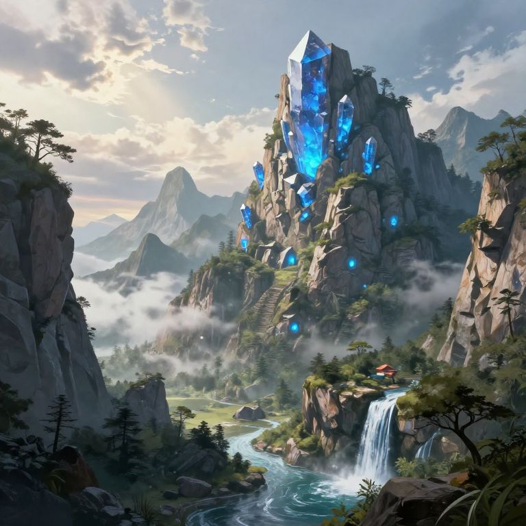 Clossal mountain giant carved from rocky cliffs with glowing blue crystals embedded in its body, overlooking a serene valley with waterfalls, magical atmosphere with soft sunlight filtering through clouds, high fantasy illustration with a blend of nature and mythical giant.