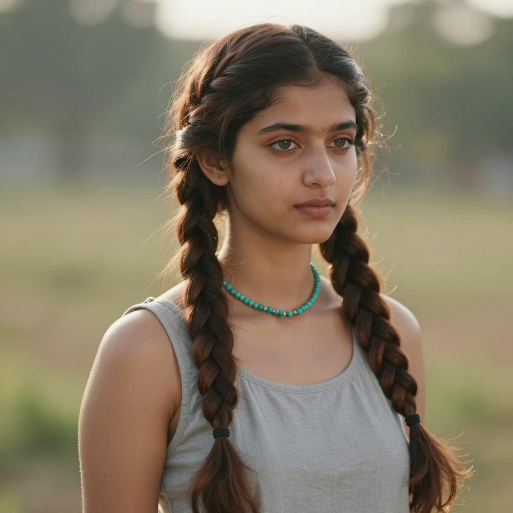 Photorealistic portrait of a young Indian woman with thick brown fish braid hairstyle. She is wearing a light grey sleeveless top and a turquoise bead necklace. The portrait is taken outdoors in soft natural light during morning or evening with a blurry green background, highlighting her serene expression and detailed hair texture.