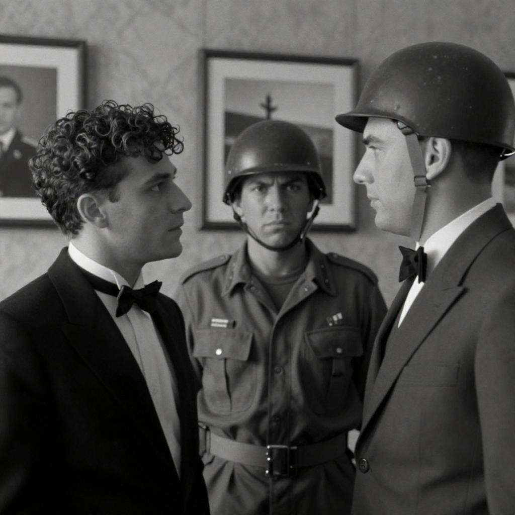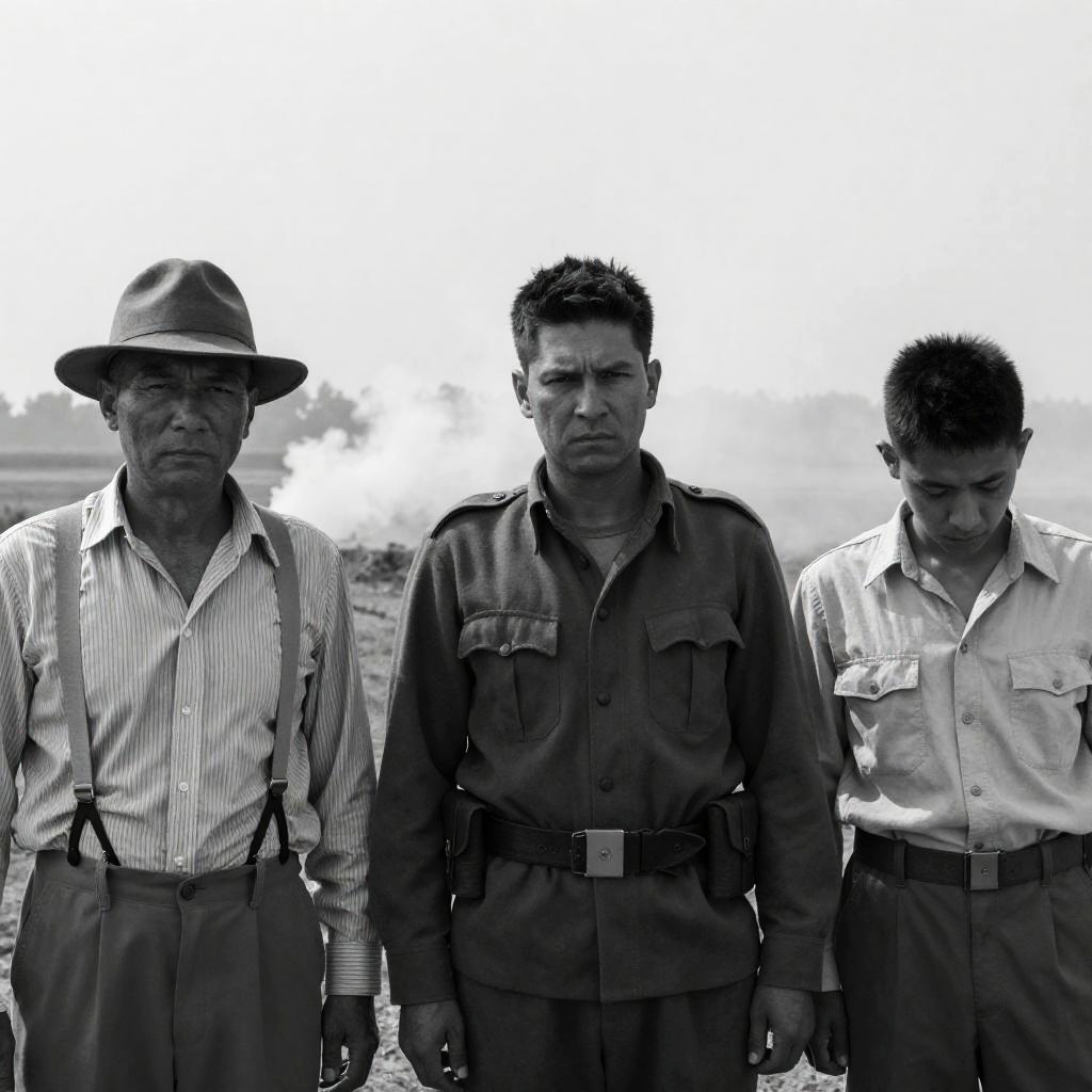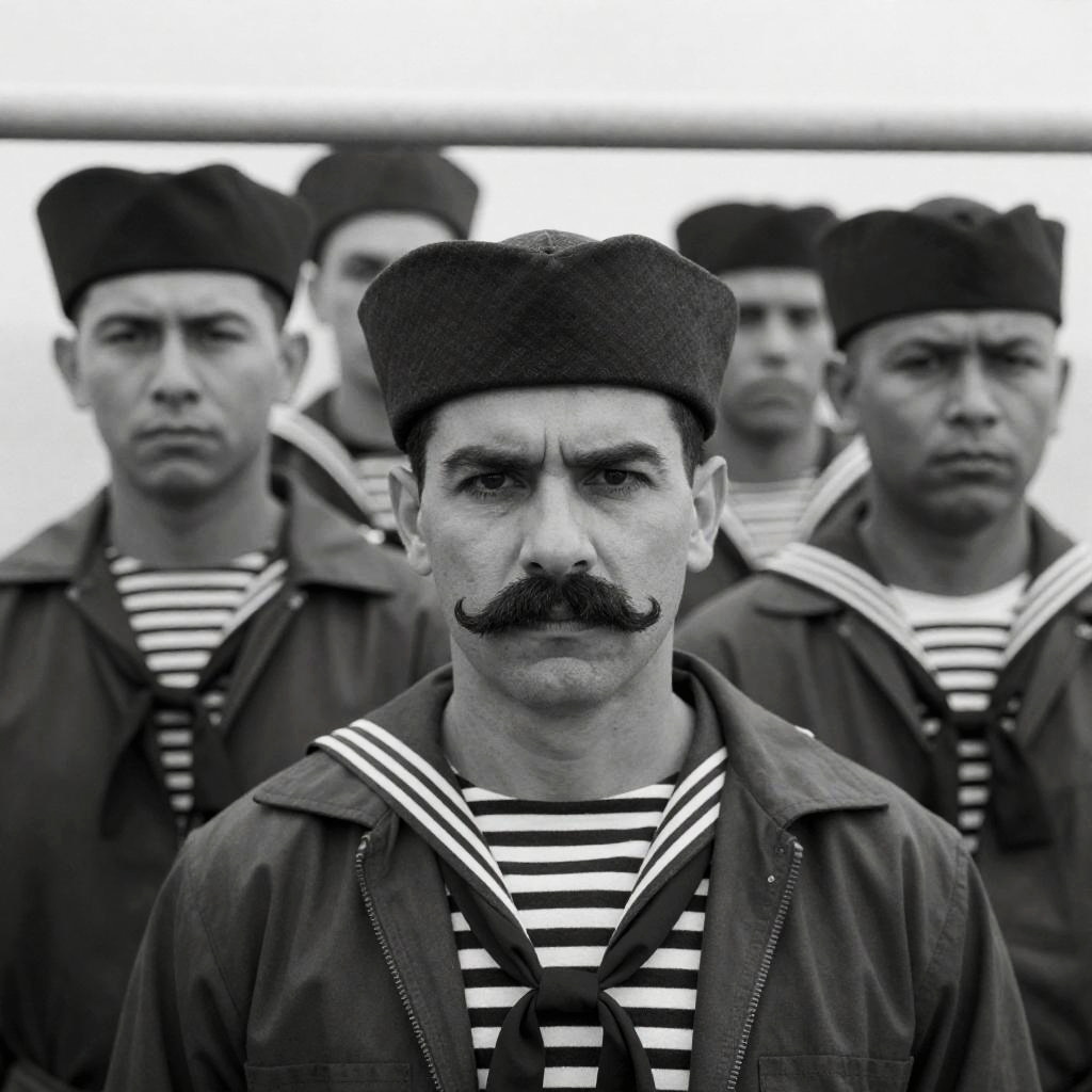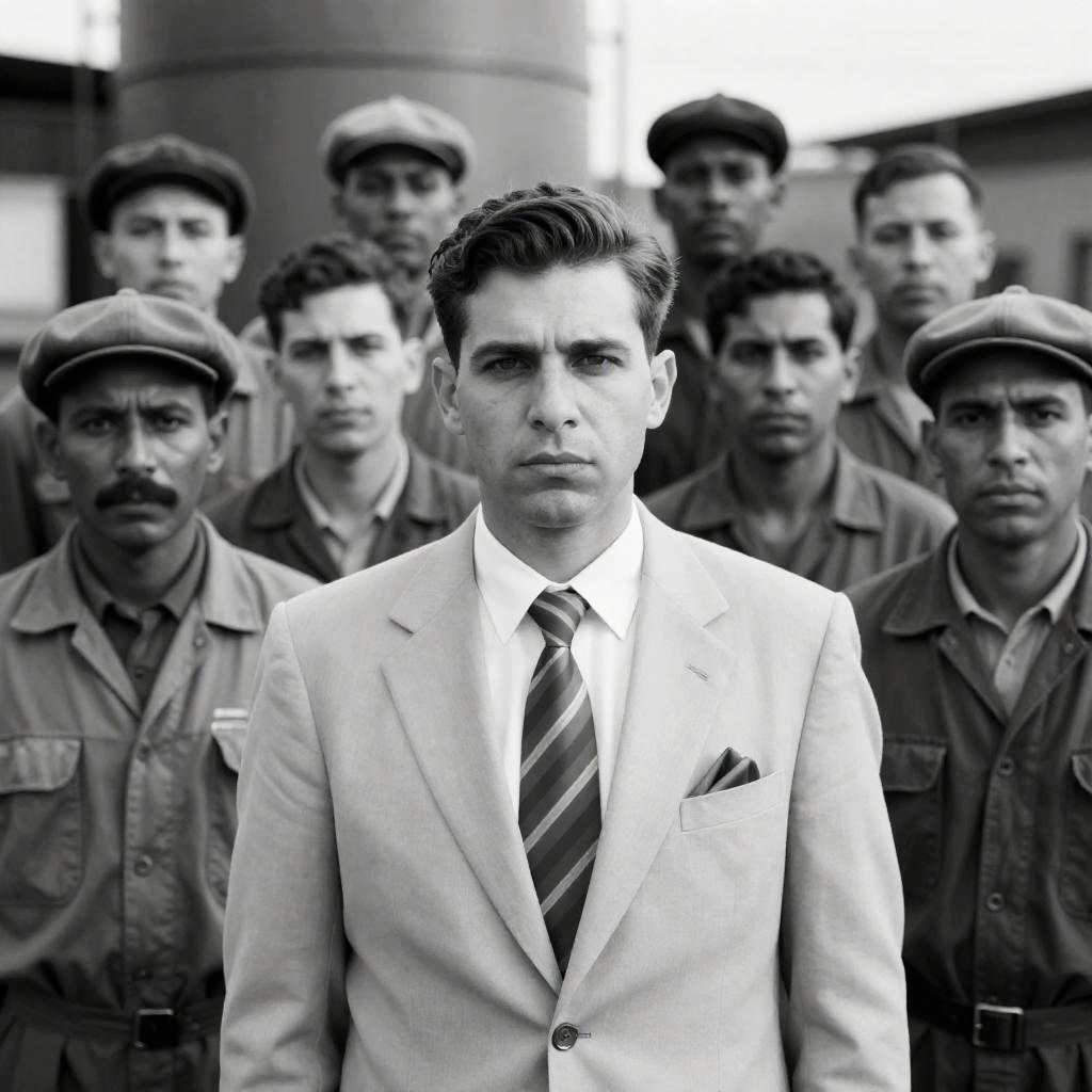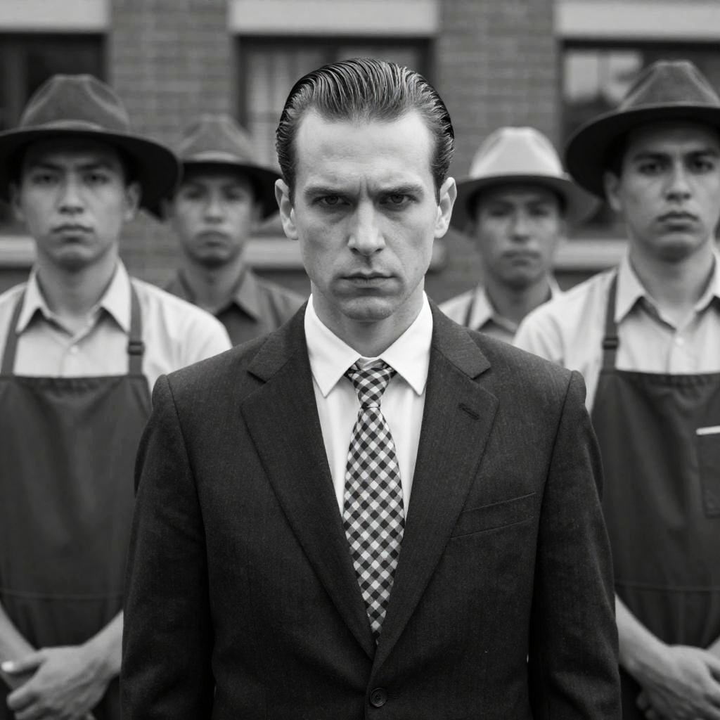 Black and white photograph. Central man in light suit, striped tie, pocket square, serious expression. Surrounding men in work clothes, flat caps, scarves, varied expressions. Industrial background. Group of eight men. Vertical composition.