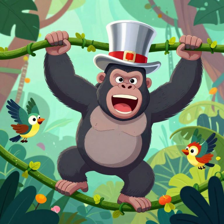 Cartoon gorilla wearing a silver top hat and red bowtie, joyfully swinging on a vine in a vibrant jungle with colorful birds.