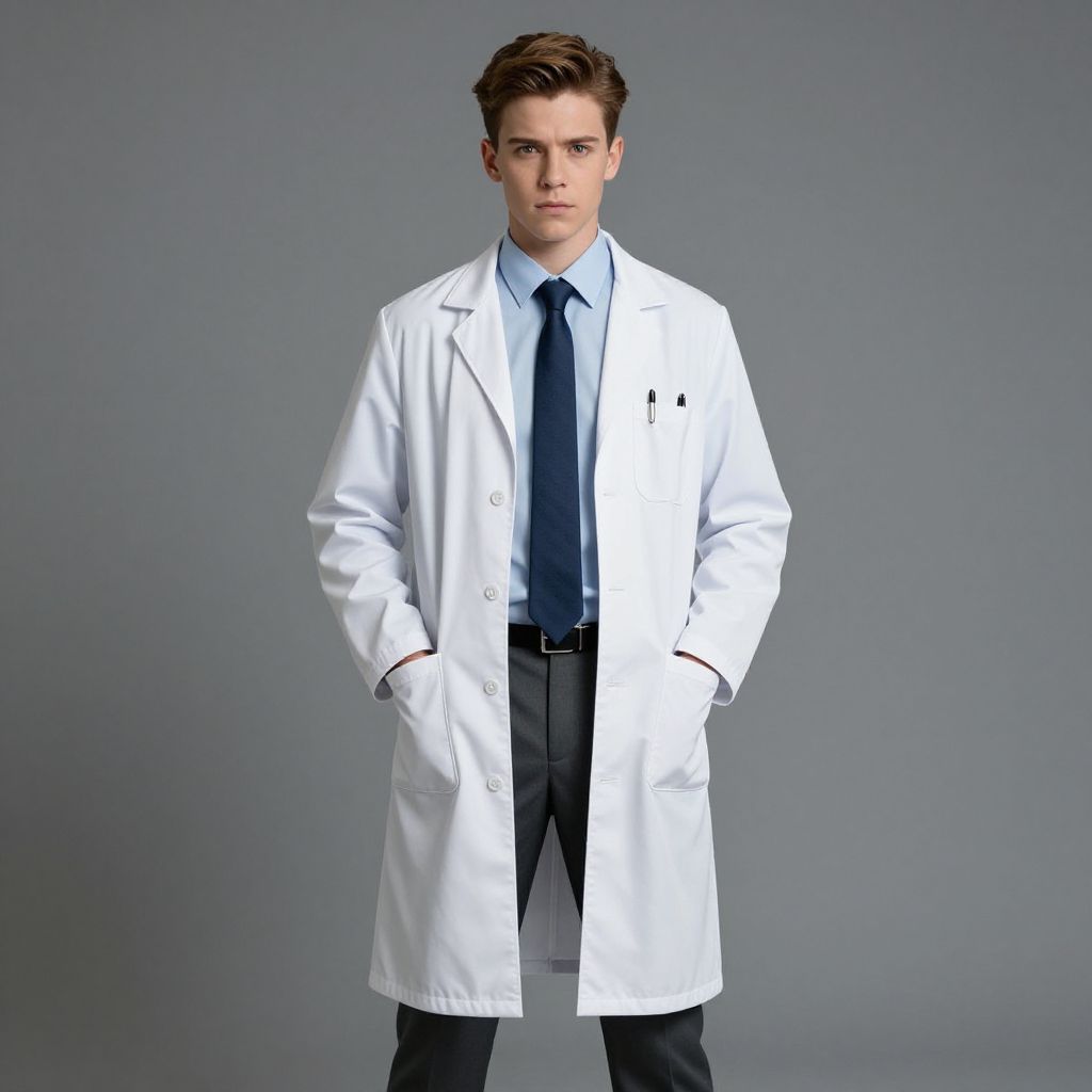 Doctor octopus costume, lab coat, 1boy, male focus, hands in pockets, solo, necktie, pants, looking at viewer, shirt