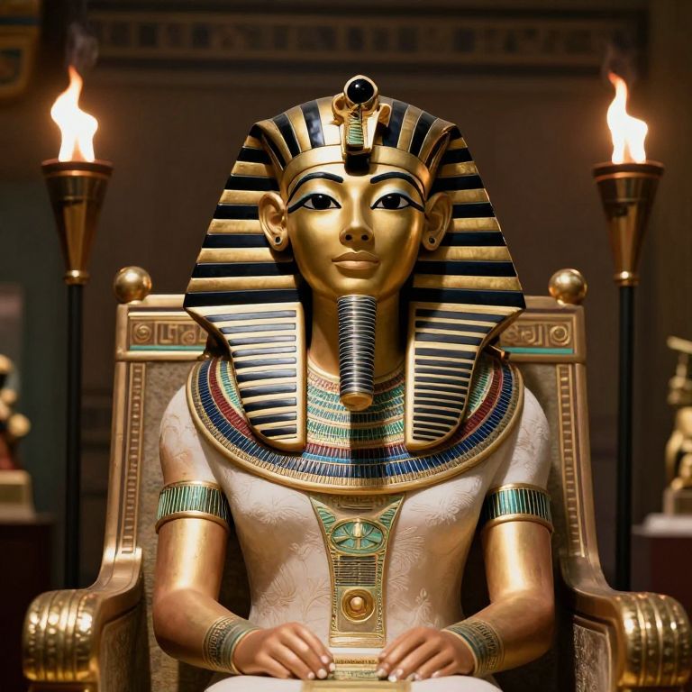 An atmospheric museum-style display photograph of a Pharaoh queen in a reimagined ancient setting, seated on a throne with ceremonial torches in the background, wearing a luxurious headpiece featuring geometric patterns in black onyx and gold leaf, her face youthful and regal with defined features, high forehead, and strong jawline, standing as a symbol of divine power.