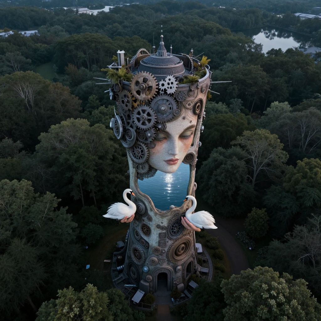 A surreal digital artwork depicting an enigmatic tower intertwined with natural elements, reminiscent of dreamlike landscapes. The tower's facade reveals intricate gears beneath its skin, merging technology and biology in a harmonious blend. Standing amidst a serene moonlit forest, the tower's face has transformed into a tranquil lake reflecting starlight, while its hands have evolved into swans gliding gracefully across the water's surface. From an aerial viewpoint, this scene instills a sense of timelessness and wonder, inviting contemplation on the intricate connection between nature and human constructs.