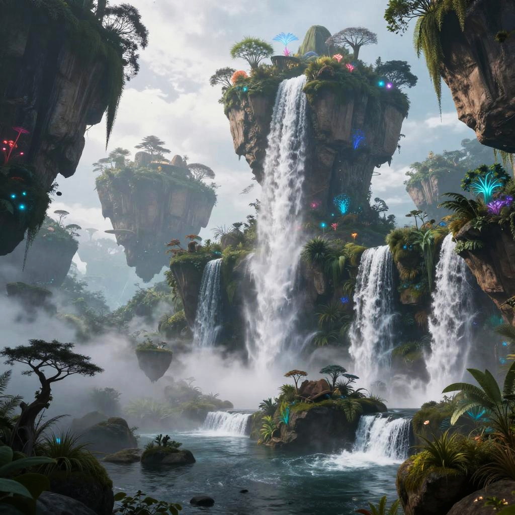 Fantasy biomes showing towering floating islands covered in bioluminescent vegetation, cascading waterfalls into a foggy abyss, ethereal environment