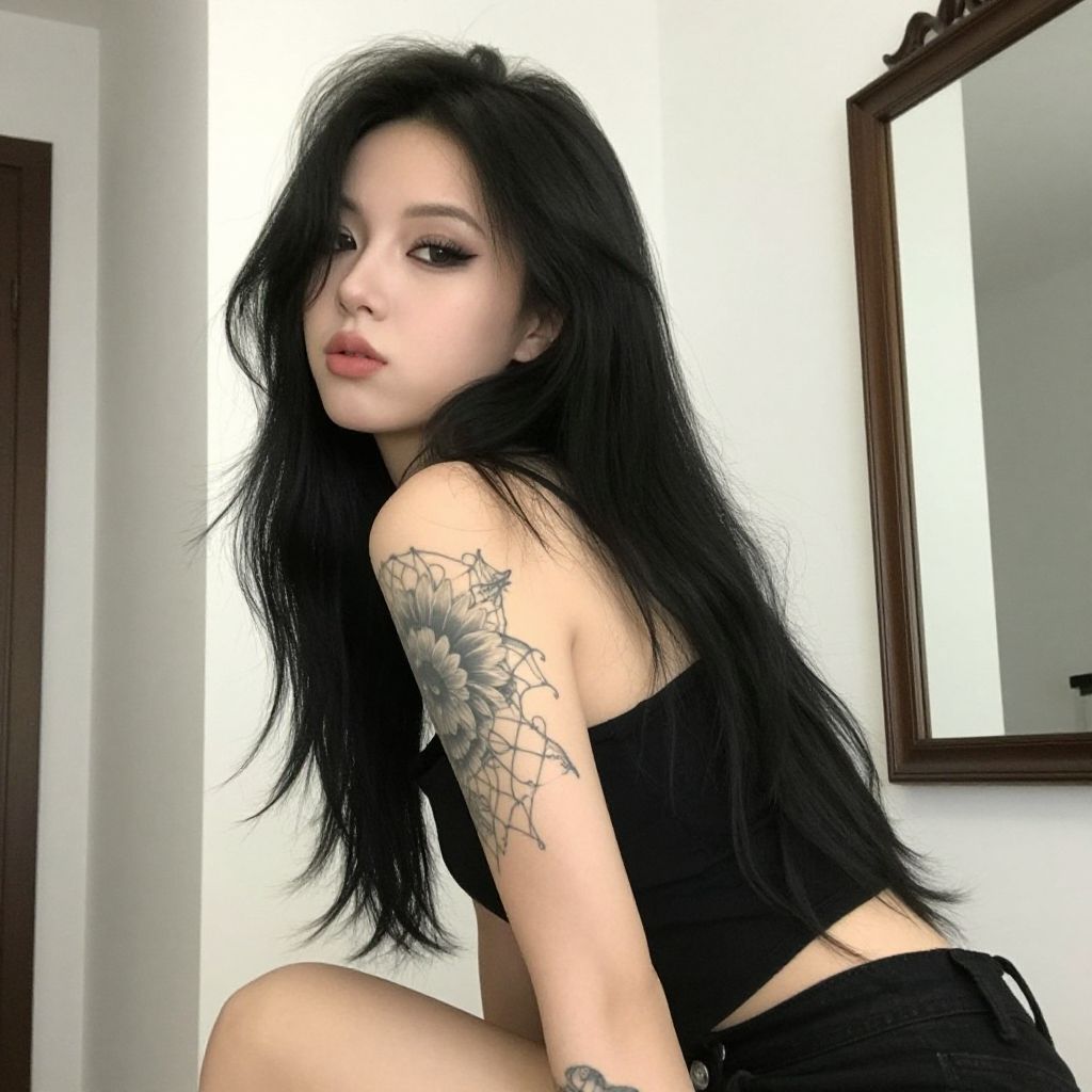 Photograph of a young woman with long, black, wavy hair and dark, dramatic makeup. She's looking over her shoulder with a slightly pouty expression. She's wearing a black, sleeveless top, showcasing intricate tattoos on her right arm, including a sunflower and web design. She's sitting in a white-walled room with a wooden-framed mirror on the right and a partially visible door on the left.