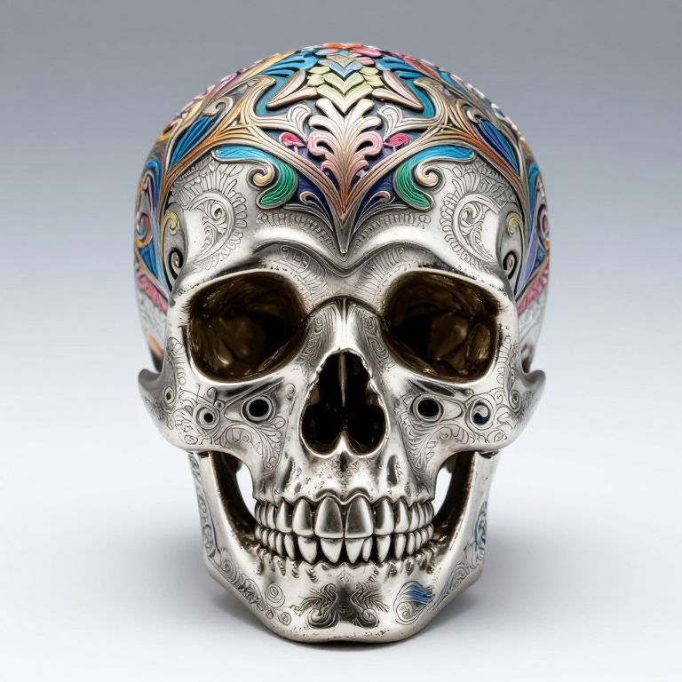 Elsa decorative photograph, platinum skull with etched multi-color pattern, gradient grey white background, forward facing perspective, fashion magazine photo,