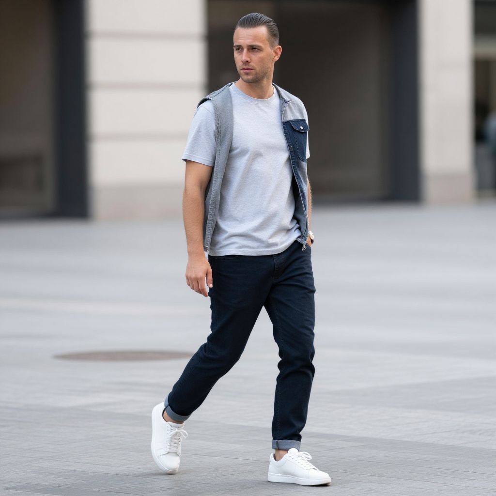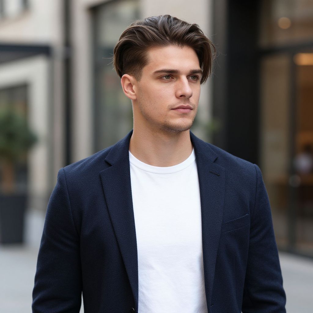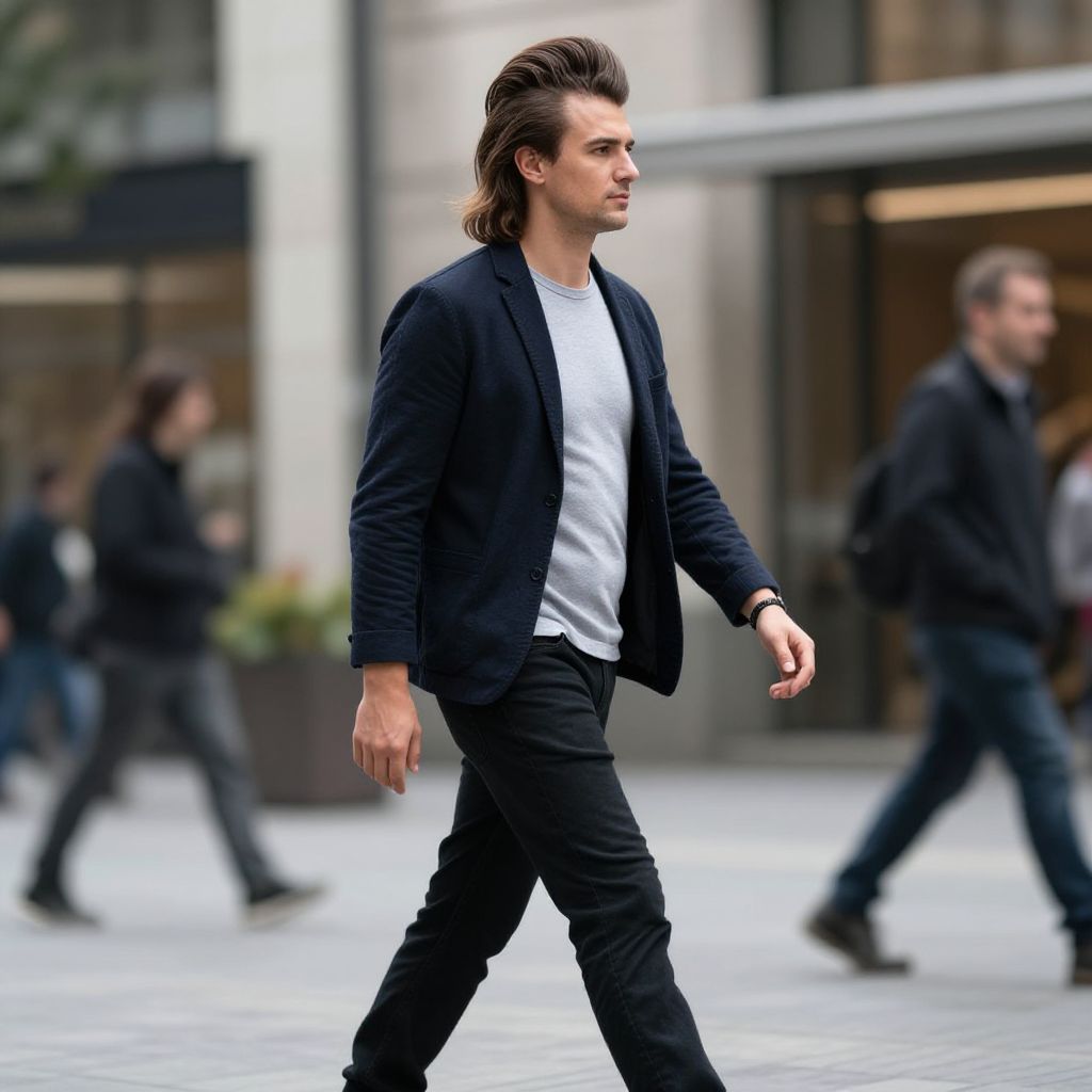 Fit European man, long pompadour hairstyle, walking in a metropolitan area, realistic photo, dynamic composition, natural colors, high detail