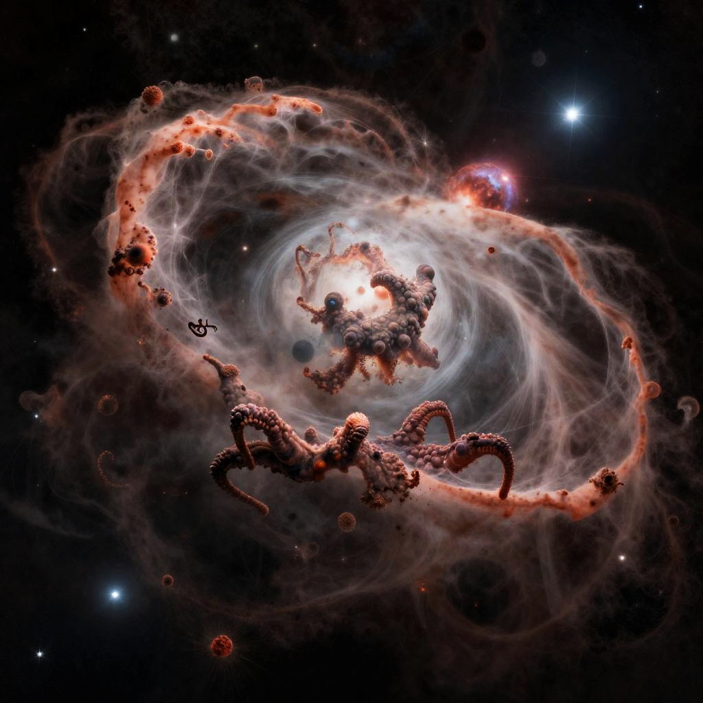 Digital artwork depicting the fictional planet Abyssalora located in the Tarantula Nebula. The image highlights mysterious cosmic structures resembling a chronomarine reef sculpted by imaginary creatures called Fluffarians, with swirling nebula clouds and glowing celestial objects.