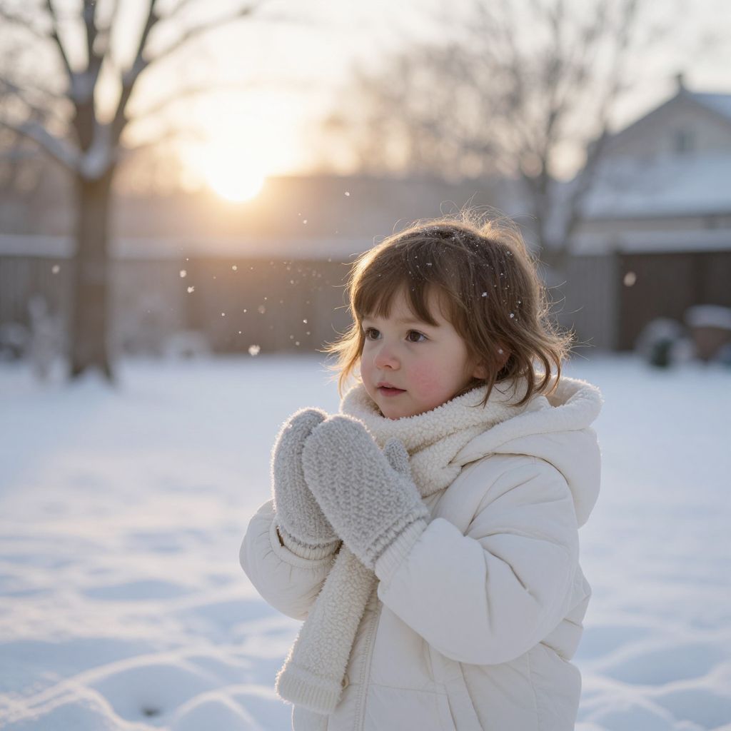 A young child with soft brown hair, warm and curious eyes, wearing a cozy white winter outfit with a hood, thick woolen mittens, and a fluffy, textured scarf, standing in a snowy backyard during a quiet winter morning. The sun is just beginning to rise behind a tree line, casting a gentle golden glow over the frosty ground, while delicate snowflakes fall softly in the background. The scene is peaceful and serene, capturing the innocence and quiet wonder of a child discovering the beauty of a winter morning — the air is still, the world hushed, and the child’s expression radiates quiet joy and curiosity, as if the first light of day is a secret only they can see.