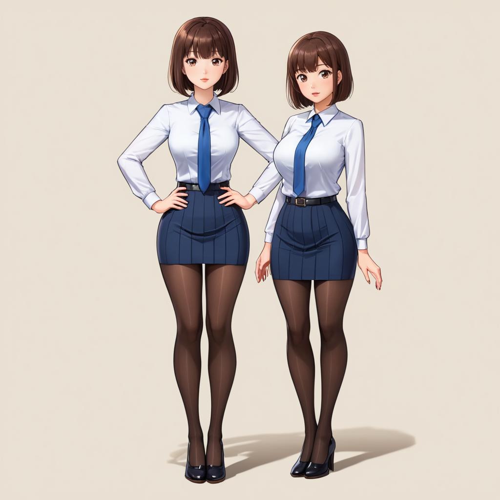 Masterpiece, 1girl, (opll:1.2), shortstack, full body, standing, (huge breasts:1.0), (pantyhose, office lady:1.1), blunt bangs, short hair, serious, simple background