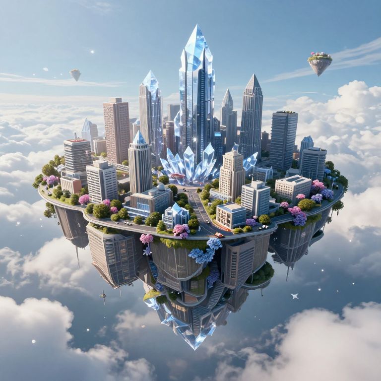 Cities grow upside-down beneath floating islands, their buildings flowering like crystals and their streets stretching upward into the clouds.