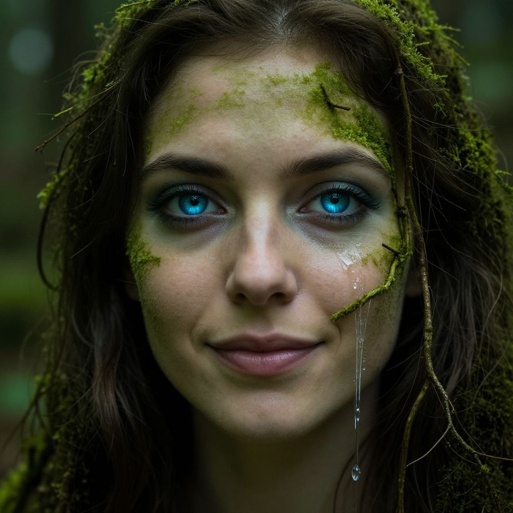 A woman's face, photorealistic, seamlessly blending into a lush forest, eyes like deep forest pools, moss hair, waterfall cascading down one cheek, a faint smile formed by twisting branches