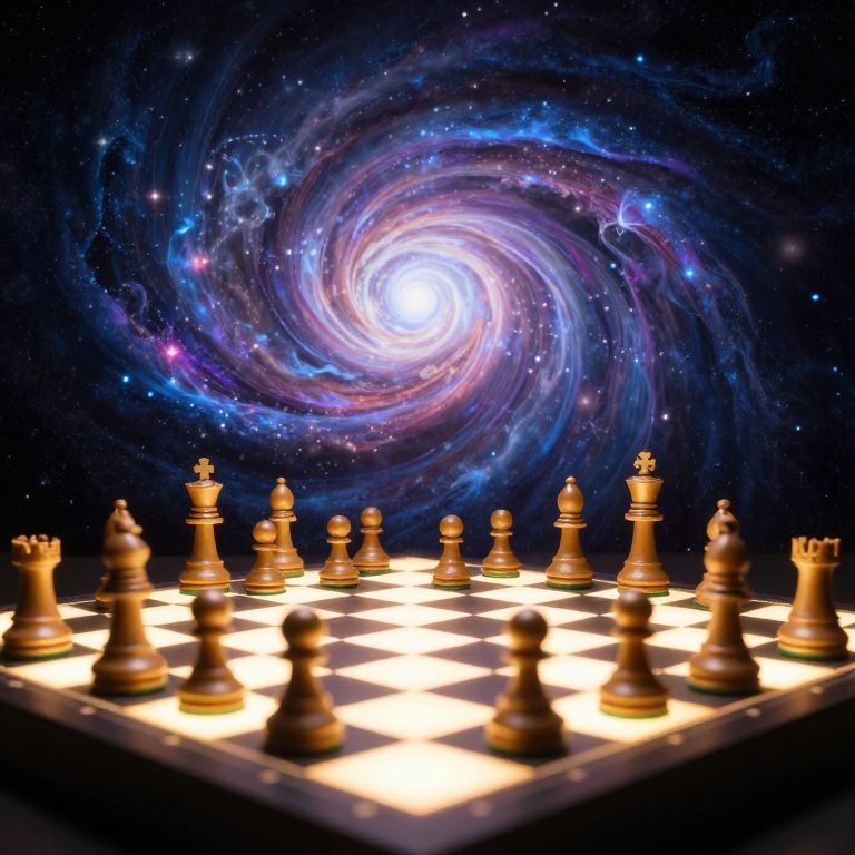 Chess pieces stand poised on a luminous board, set against the backdrop of a swirling cosmic vortex and a starry expanse, as if the universe itself is the arena for this celestial game.