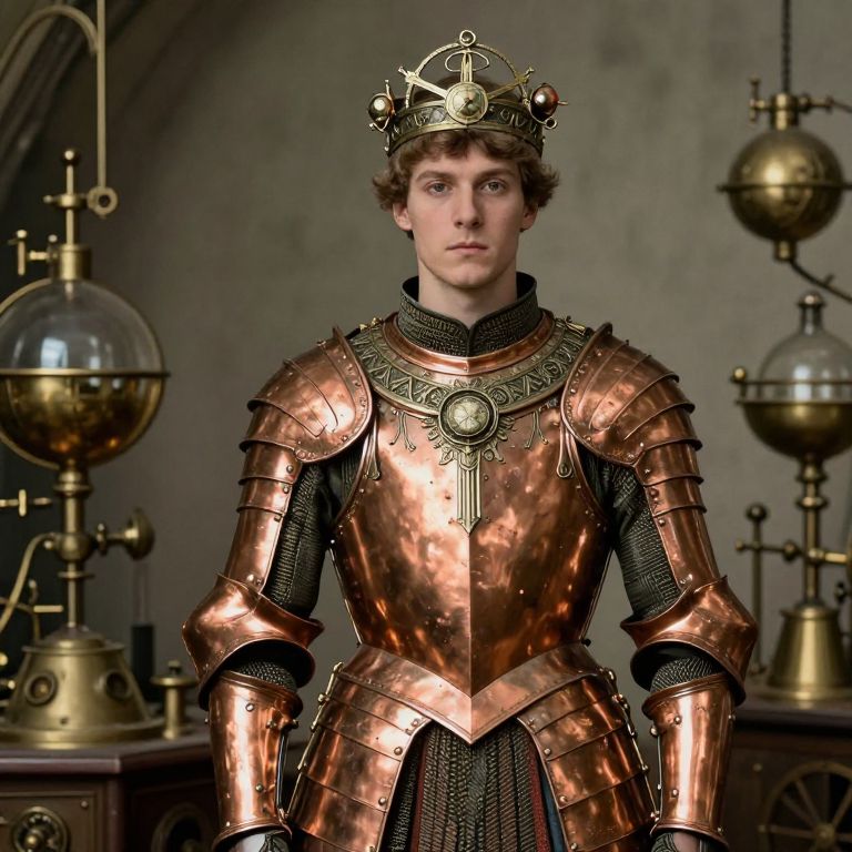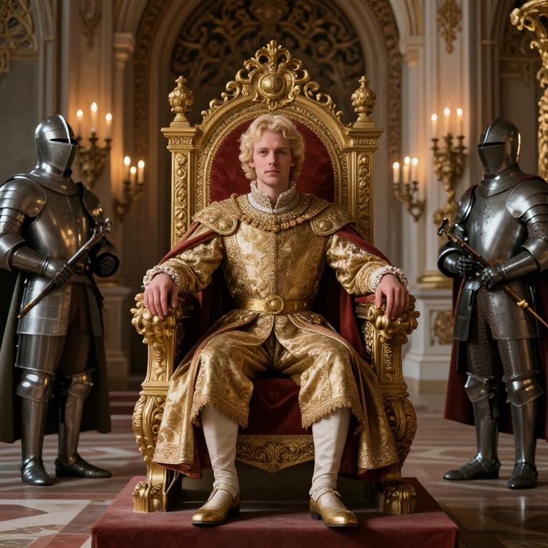 Blonde prince seated on an ornate throne surrounded by loyal knights and courtiers, detailed renaissance style palace interior, warm candlelight illuminating intricate patterns, noble and serene demeanor.