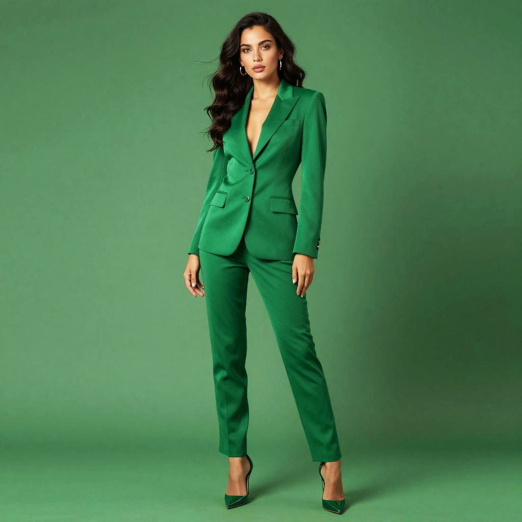 Photograph of a confident woman with long black hair, wearing a green blazer and matching pants, standing against a green background. She has high heels
