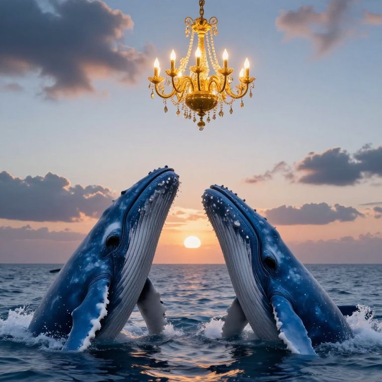 Photograph of two large, blue-gray humpback whales with white pectoral fins and intricate textures, breaking through the ocean surface, facing each other with mouths slightly open. Above them, a golden chandelier with lit candles hangs against a stunning sunset sky, featuring pink, orange, and purple clouds. The sun is setting over the horizon, reflecting off the calm ocean water. The surreal scene blends natural marine life with an elegant, luxurious chandelier, creating a striking contrast between the wild and the ornate.