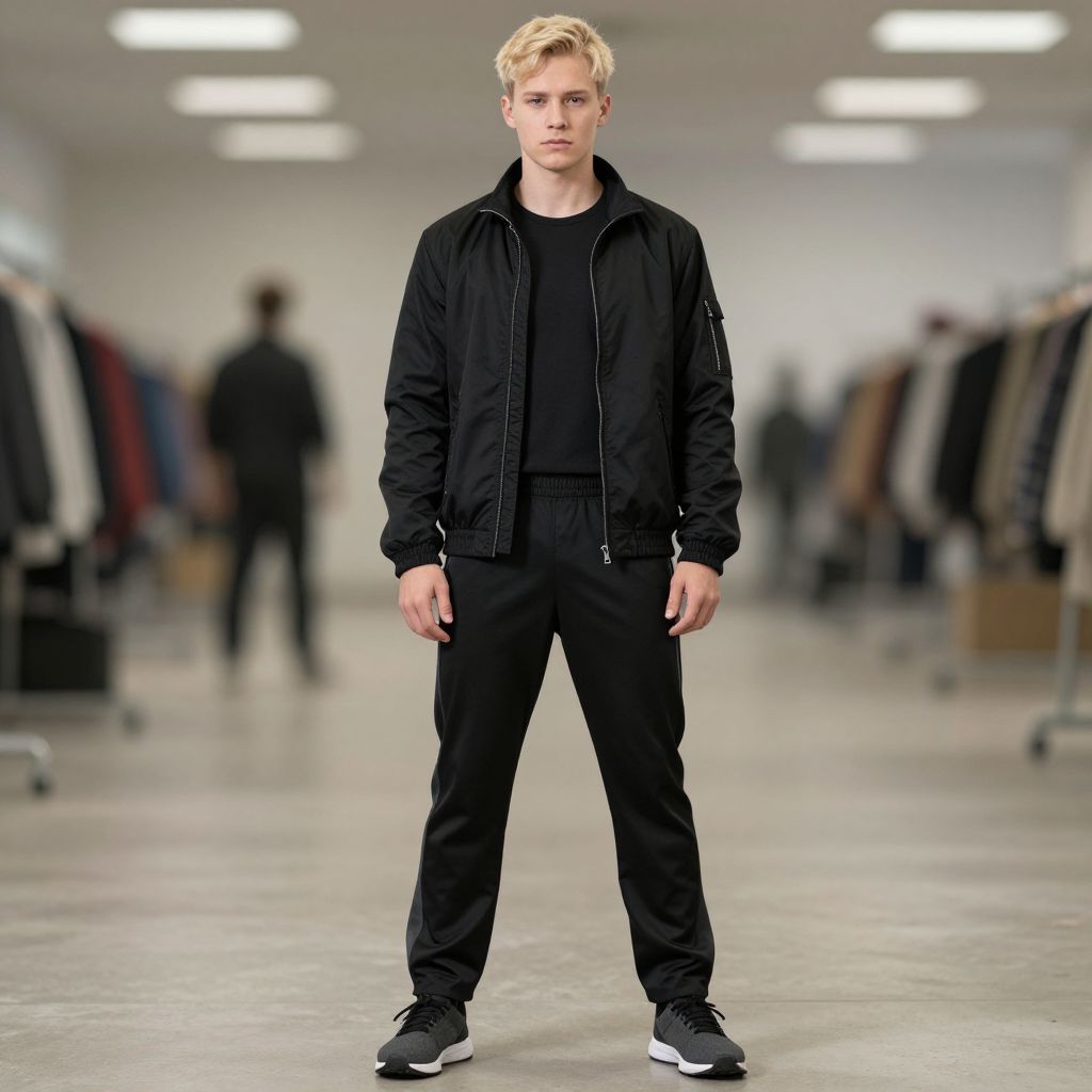 Photograph of a young, blonde-haired, Caucasian male model standing in a brightly lit, modern fashion showroom. He wears a black jacket over a black t-shirt, black pants, and black sneakers with white soles. The background features blurred racks of clothing and a few indistinct figures, creating a shallow depth of field effect. The model stands confidently in the center, facing the camera with a neutral expression. The floor is polished concrete, and overhead lights illuminate the space evenly. The overall style is minimalist and contemporary.