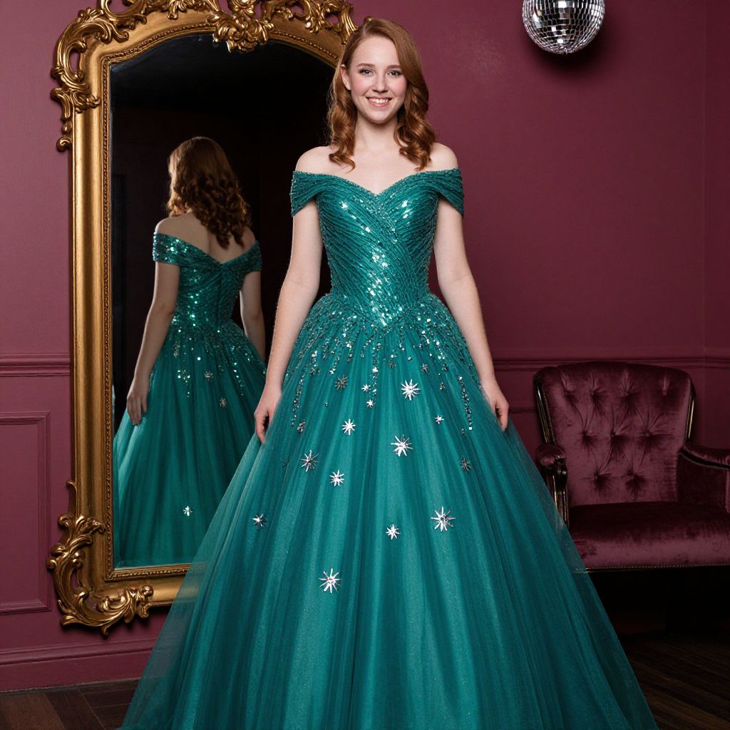 Photograph of a smiling young woman with fair skin and wavy auburn hair, wearing an off-the-shoulder, teal ball gown adorned with sparkling sequins and white star-like embellishments. The gown has a voluminous, tulle skirt. She stands in front of an ornate, gold-framed mirror reflecting her back, set against a deep maroon wall. To the right, a plush, purple velvet couch is partially visible. Above the couch, a small, round disco ball hangs, adding a touch of sparkle to the elegant, vintage-style room.