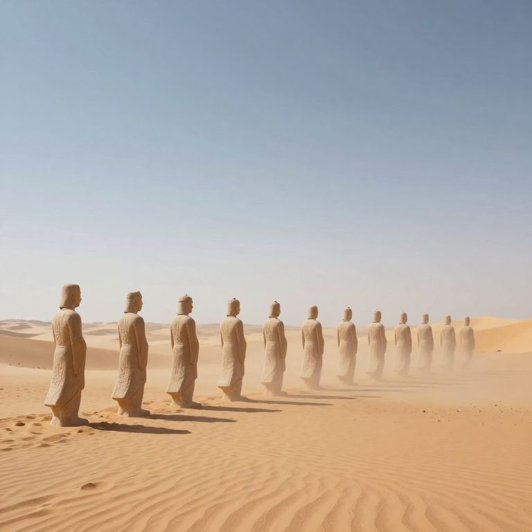 An ethereal procession of stone figures marches across a mirage-drenched desert, their synchronized steps echoing an ancient ritual of transience and eternity, where the heat distorts reality and the stillness whispers of timeless solitude.
