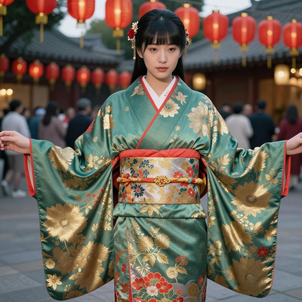 Chinese attire female, photorealistic, Asian woman, standing, traditional Chinese festival outfit, green silk kimono with gold floral patterns, red and gold obi belt, silver skirt with red and gold flowers, black straight hair with red and gold hairpins, calm expression, soft natural light, Chinese temple background, red lanterns, evening, detailed ures, realistic shadows, traditional Japanese art style, festive atmosphere, cultural attire, high detail, accurate lighting, traditional clothing, cultural heritage, realistic colors.