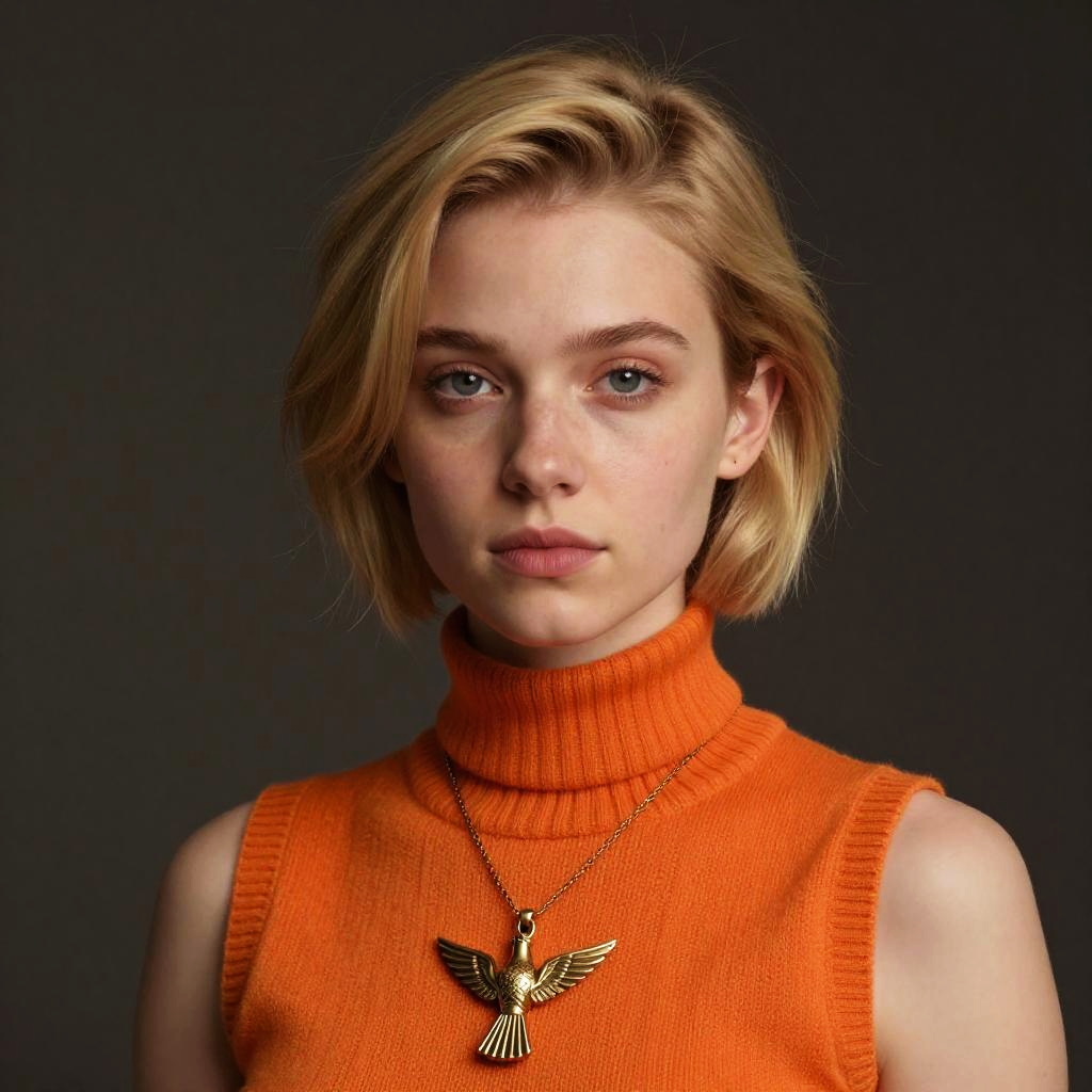 8k, best quality, real picture, intricate details, ultra-detailed, ultra highres, depth field, (photorealistic, realistic:1.2), masterpiece, photo of 25yo girl, short hair, (blond hair:1.2), wearing an orange sleeveless sweater, turtleneck, wearing a bird pendantbest quality, realistic, photorealistic, (intricate details:1.2), (delicate detailed), (cinematic light), clear line, sharp focus, realistic face, detailed faceunity 8k wallpaper, ultra high res, (photorealistic:1.4), looking at viewer