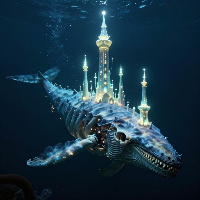 Bioluminescent spires and towers rise majestically from the hollowed-out ribcage of a colossal slumbering leviathan, its glowing architecture nestled within the creature's skeletal frame, casting an ethereal glow that illuminates the dark, aquatic surroundings.