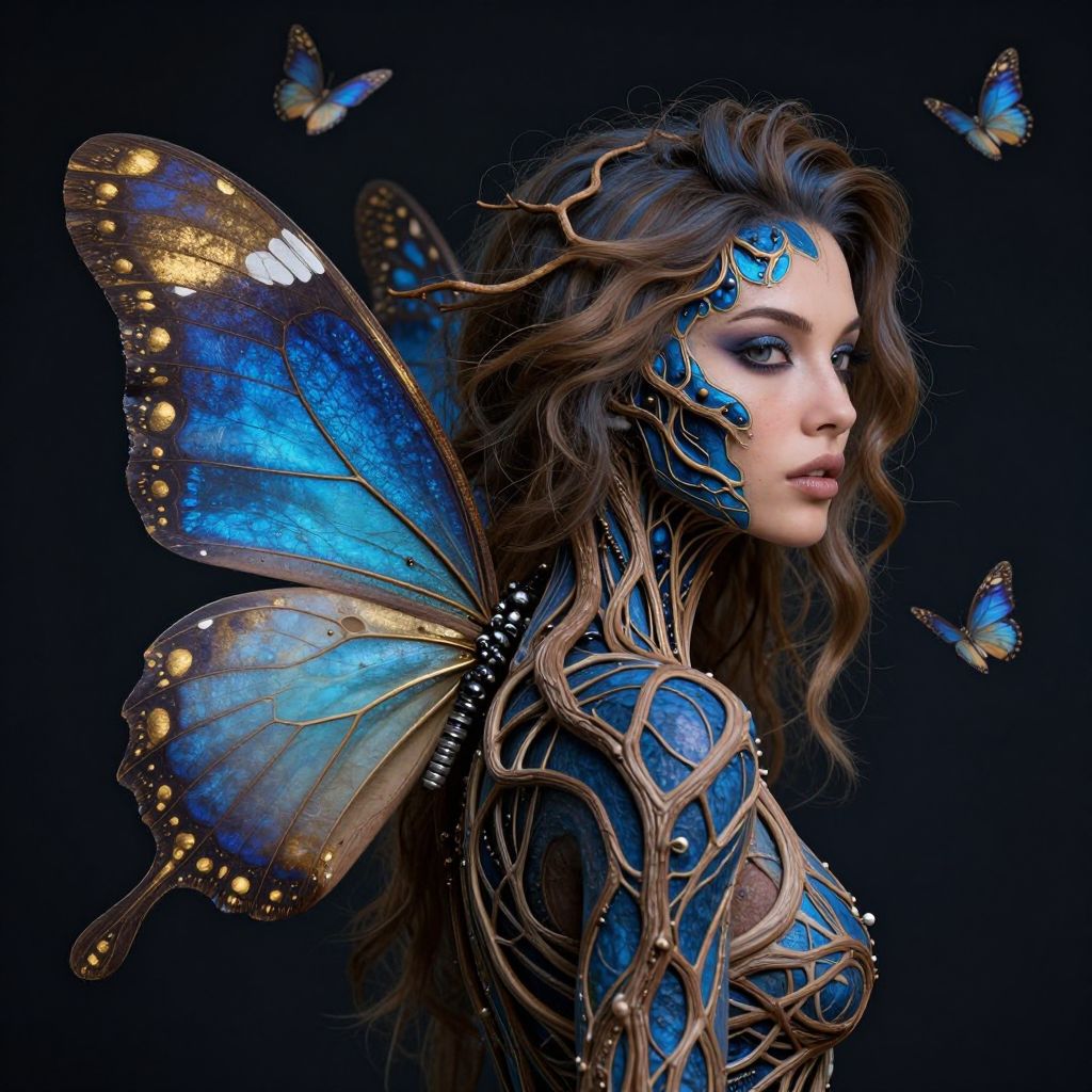 The image depicts a striking hypermetamorphosis of a woman, where her body and face are intricately transformed into a blend of organic and mechanical elements. Her skin is adorned with a network of veins and branches, resembling a tree or a network of veins, with a deep blue and brown color palette. The woman's hair is styled in loose waves, adding to the naturalistic feel. On her shoulder and back, there are large, detailed butterfly wings, with a striking blue and gold pattern that extends down her back, creating a sense of motion and transformation. The wings are not just decorative but seem to be part of her body, seamlessly integrated with her skin. Small butterflies float around her, enhancing the ethereal and metamorphic theme. The overall composition is balanced, with the woman's face and the butterfly wings being the focal points, while the intricate details of the veins and branches add depth and complexity to the image. The background is dark, which contrasts with the vibrant colors of the woman's transformation, making her the central figure in this surreal and captivating scene.