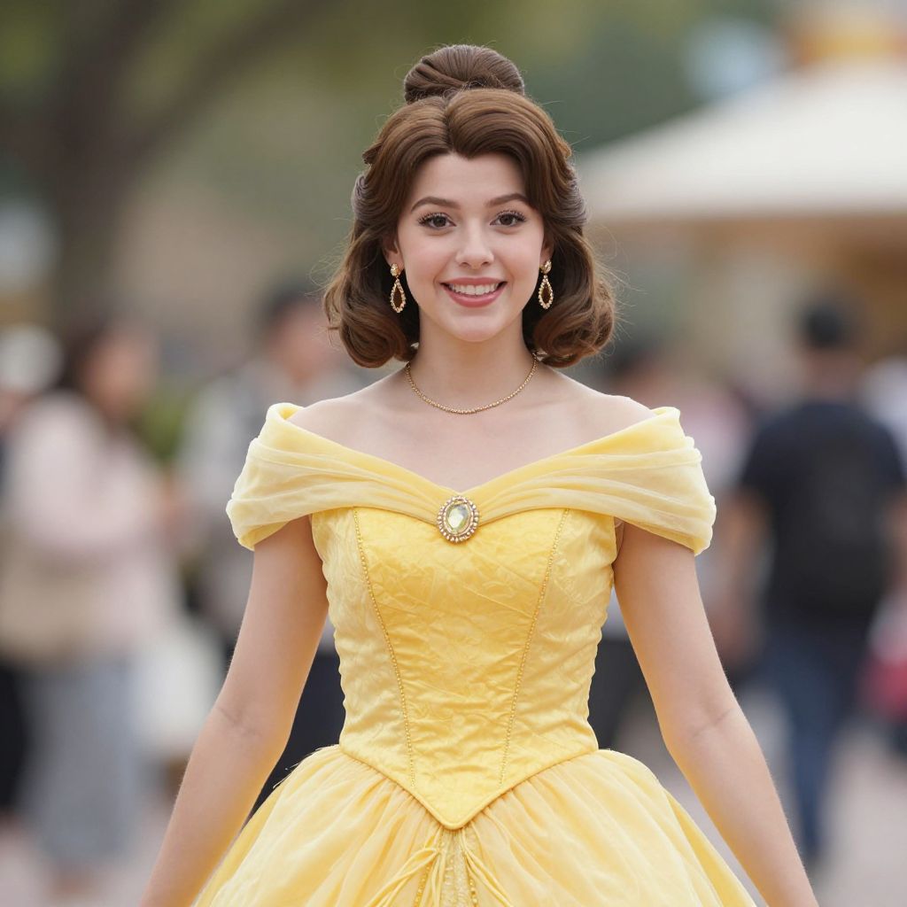 Photograph of a smiling young woman with fair skin and brown, wavy hair styled in a 1950s-inspired updo. She wears an off-the-shoulder, bright yellow, strapless ball gown with puffed sleeves and a fitted bodice adorned with a large, oval brooch at the center. She also wears dangling silver earrings and a delicate gold necklace. The background is blurred, showing an outdoor setting with trees and people in casual attire. The image has a soft, natural light, enhancing the vibrant yellow of her dress and her cheerful expression. The style suggests a Disney-inspired costume, reminiscent of a princess character.