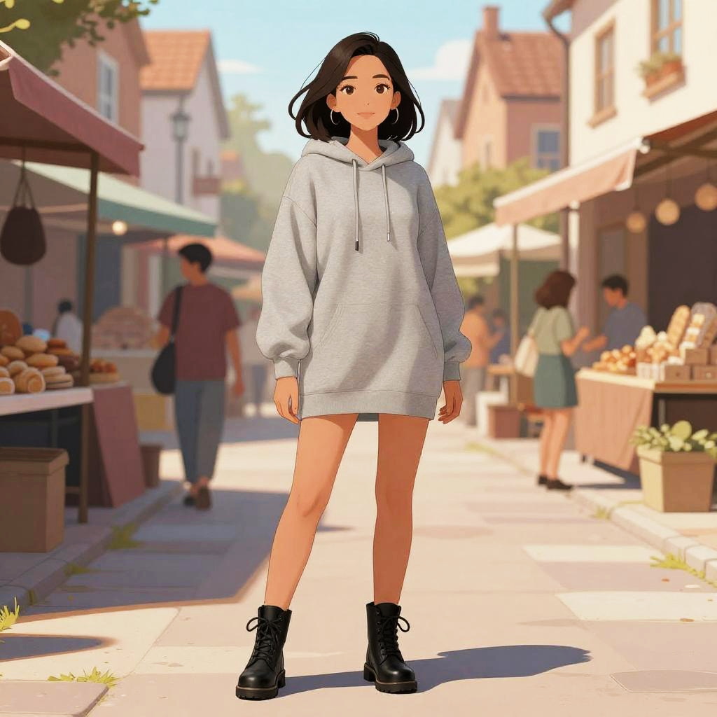A tall woman in casual streetwear, wearing an oversized brown hoodie with a graphic dollar bill print and high-waisted faux leather pants, stands in an outdoor market under colorful umbrellas, captured in a vibrant Toei animation style. Sexy. Pretty face and beutiful eyes
