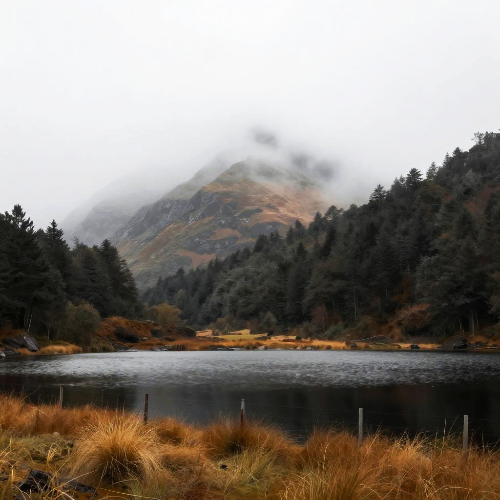 This is a digital art piece featuring a serene landscape with a fog-covered mountain in the background. The mountain is partially hidden by white mist, and it's flanked by dark, forested hills. In the foreground, there's a calm lake reflecting the misty sky, bordered by dry, golden grass and a simple wire fence. The image has a high-contrast, almost painterly style with a white, bright upper section.