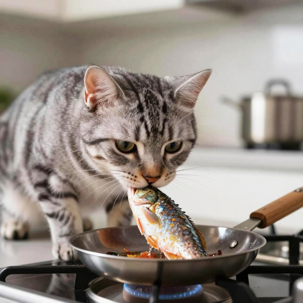 Close-up photography of (grey tabby cat:1.2), cooking fish, (c4ttitude:1.3), in glasstech kitchen, hyper realistic, intricate detail, (foggy:1.1), pov from below
