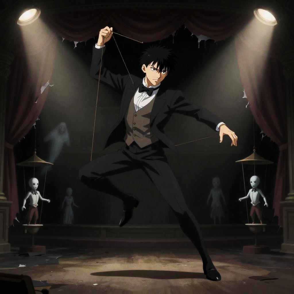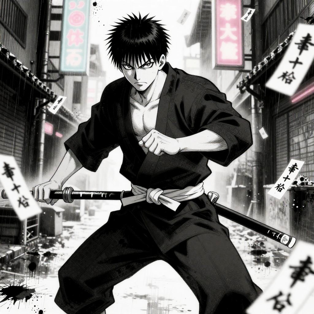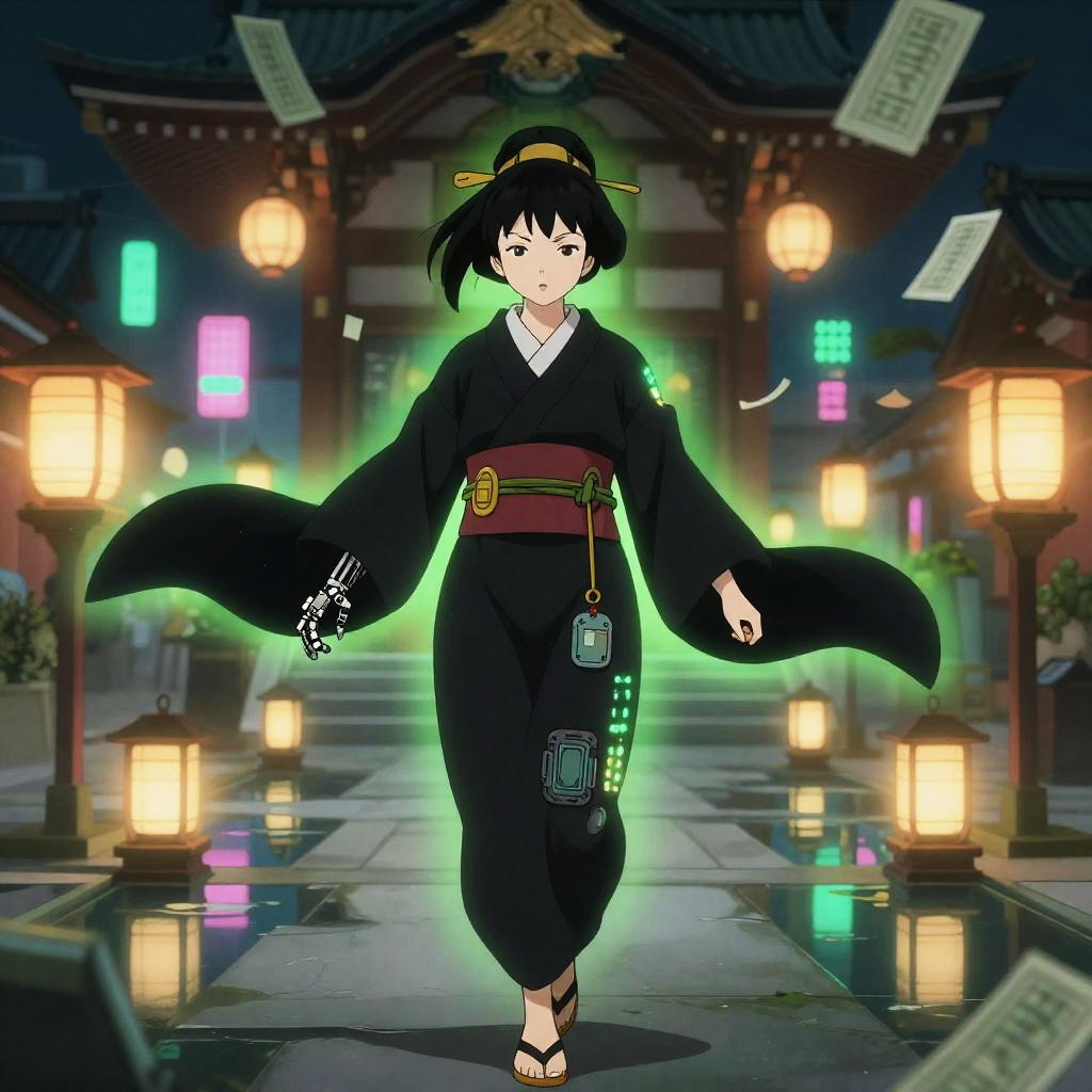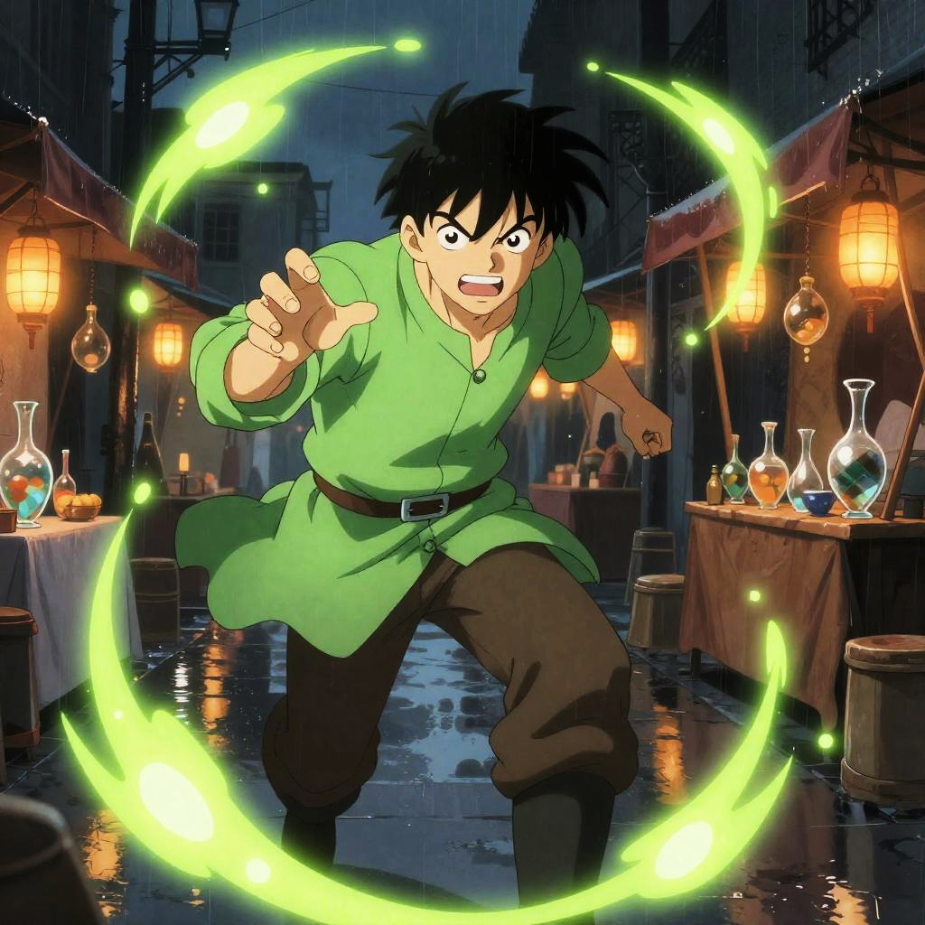 Dynamic illustration of a cunning street alchemist in the signature style of Tatsuki Fujimoto, featuring alchemical green-lime glow with drifting luminous motes and a background filled with rain-slick quay market of living lanterns and glass-vial stalls