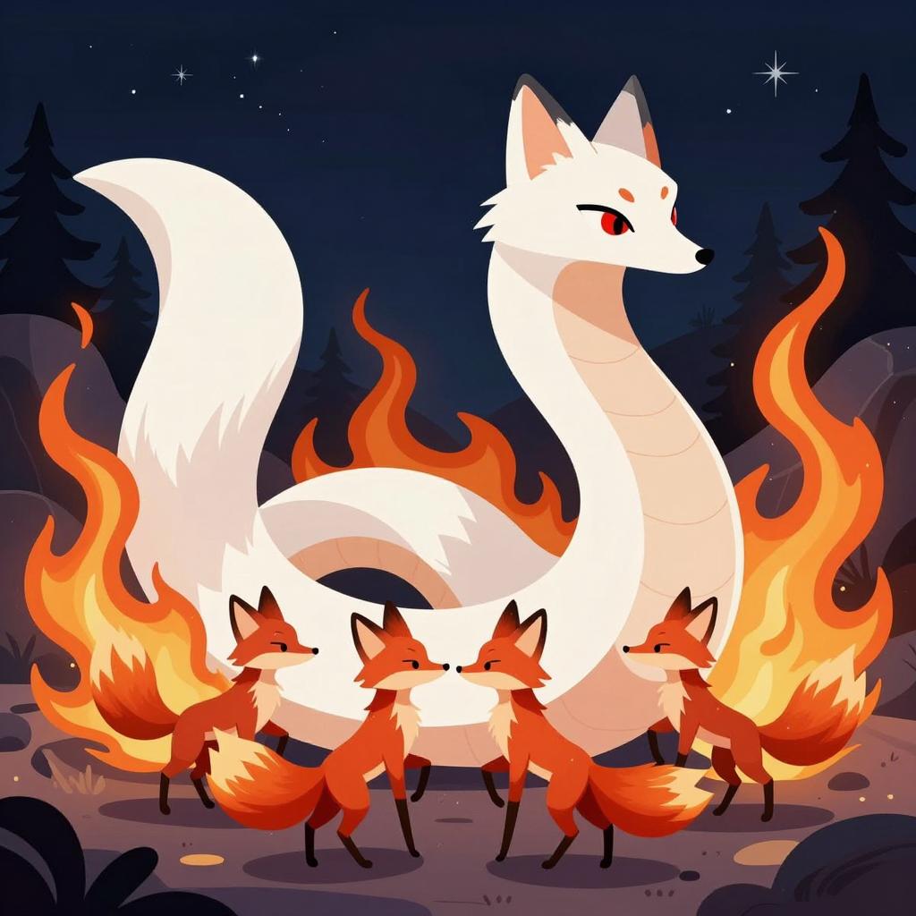 Illustration of a night scene with a large, white, serpent-like fox standing upright on the right. It has red eyes and a long tail with orange flames. In the foreground, four smaller red foxes with orange flames dance on a rocky surface. The background shows a dark blue sky with stars and trees. The foxes' tails are large and flame-like. The style is digital art with bold lines and vibrant colors. The large fox's body curves around the smaller foxes.