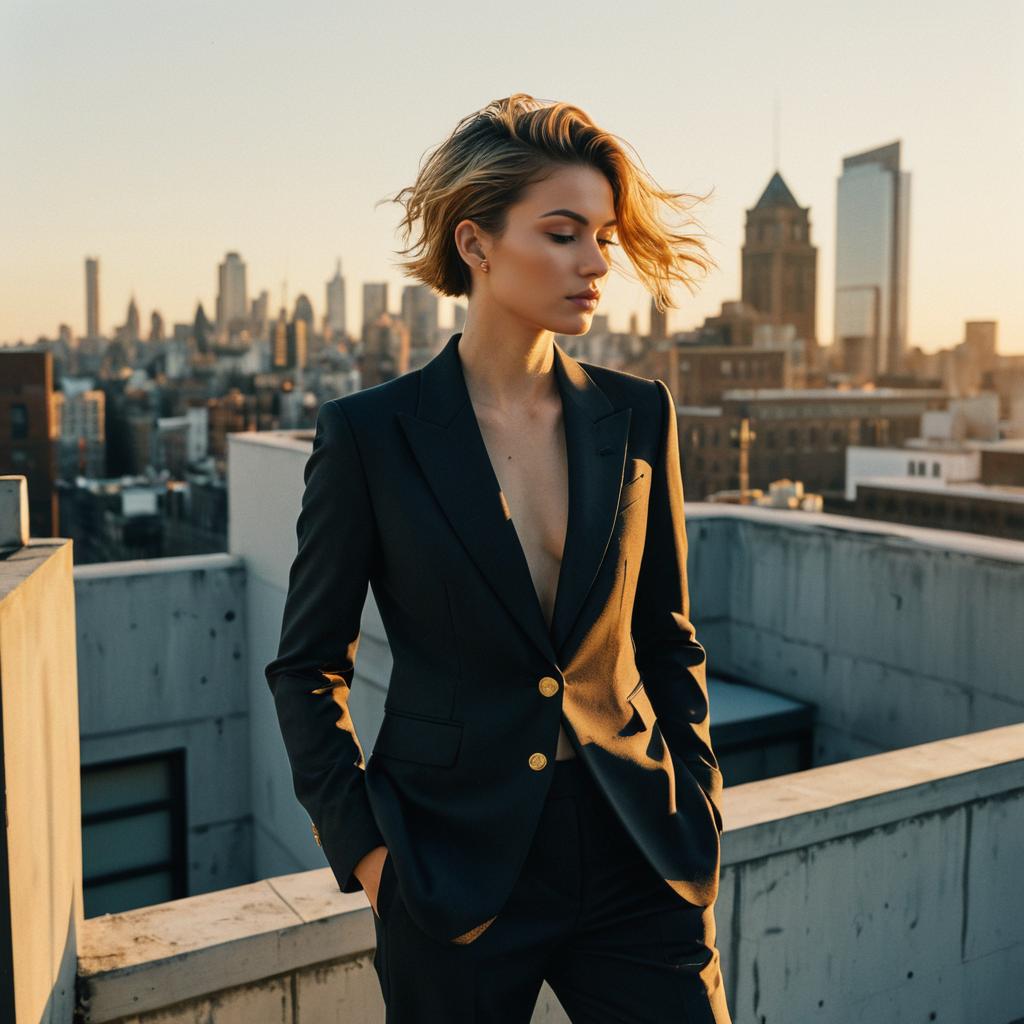 Mid Fade hairstyle on fashion model, wearing leather jacket and jeans, in studio, captured in fashion editorial style with golden hour lighting.