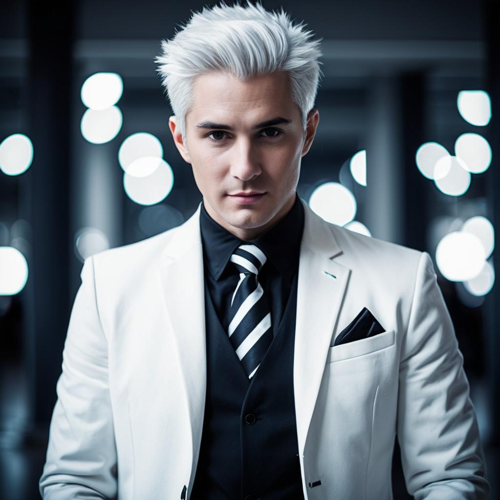 Cosplay Mr Negative fitted white jacket, black shirt and tie, short dazzling white hair, stylish formal cosplay concept, vignetting, bokeh