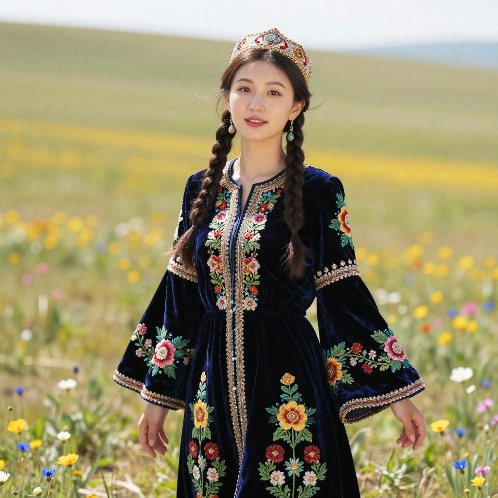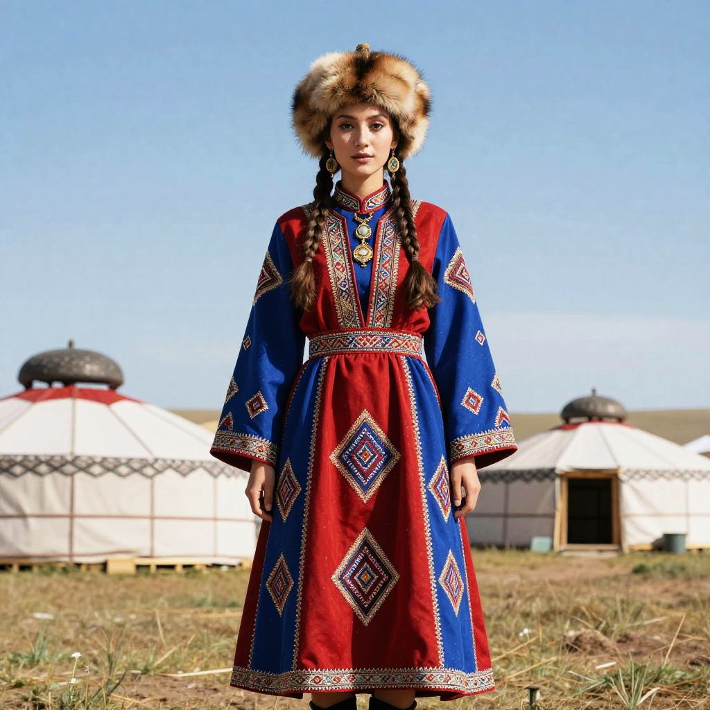 Portrait of a person wearing traditional Kazakh clothing, displaying detailed textures of wool and silk, elegant adornments, and ornate jewelry, standing in front of a yurt with decorative patterns, embodying the nomadic lifestyle and ancient customs of Kazakhstan.