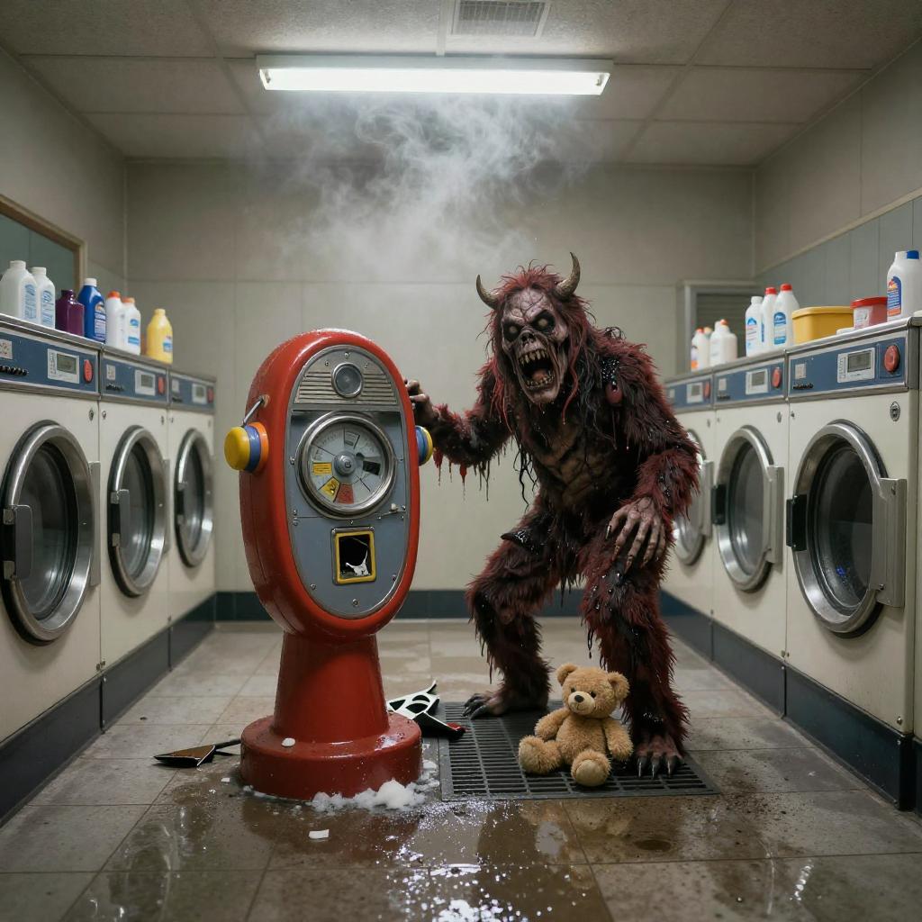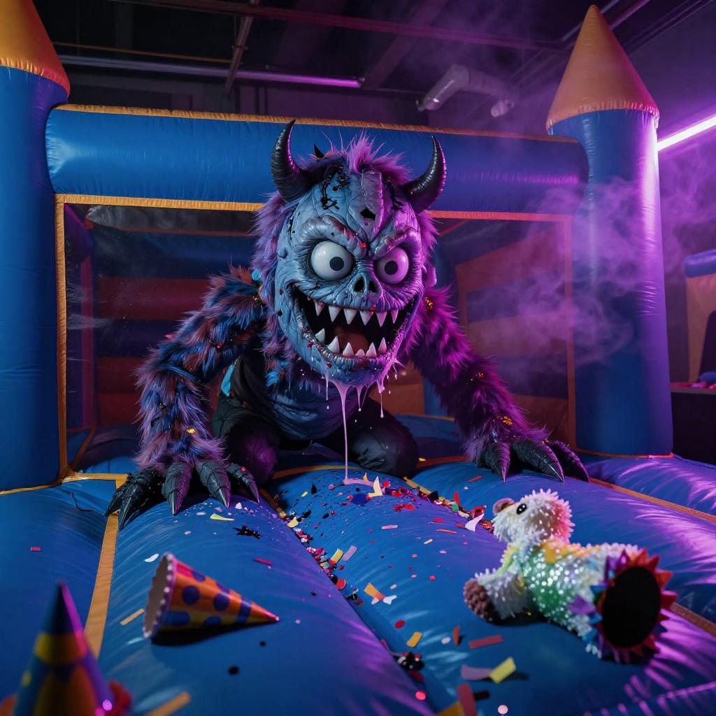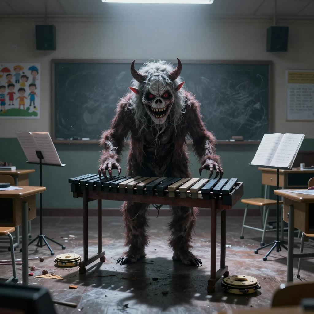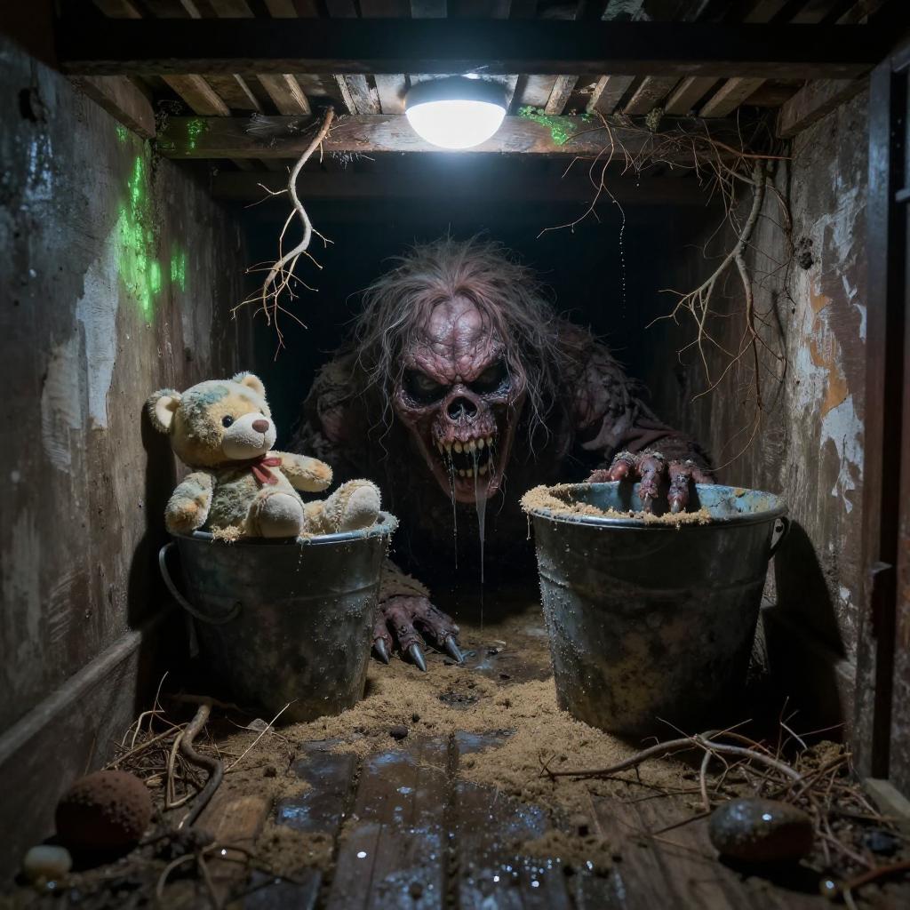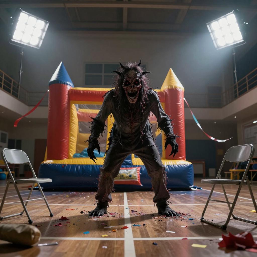 A horrifying monster lurking in storage closet beneath bleachers (stacked lost-and-found kids' jackets, damp paper trophies, forgotten sports equipment), neon lighting