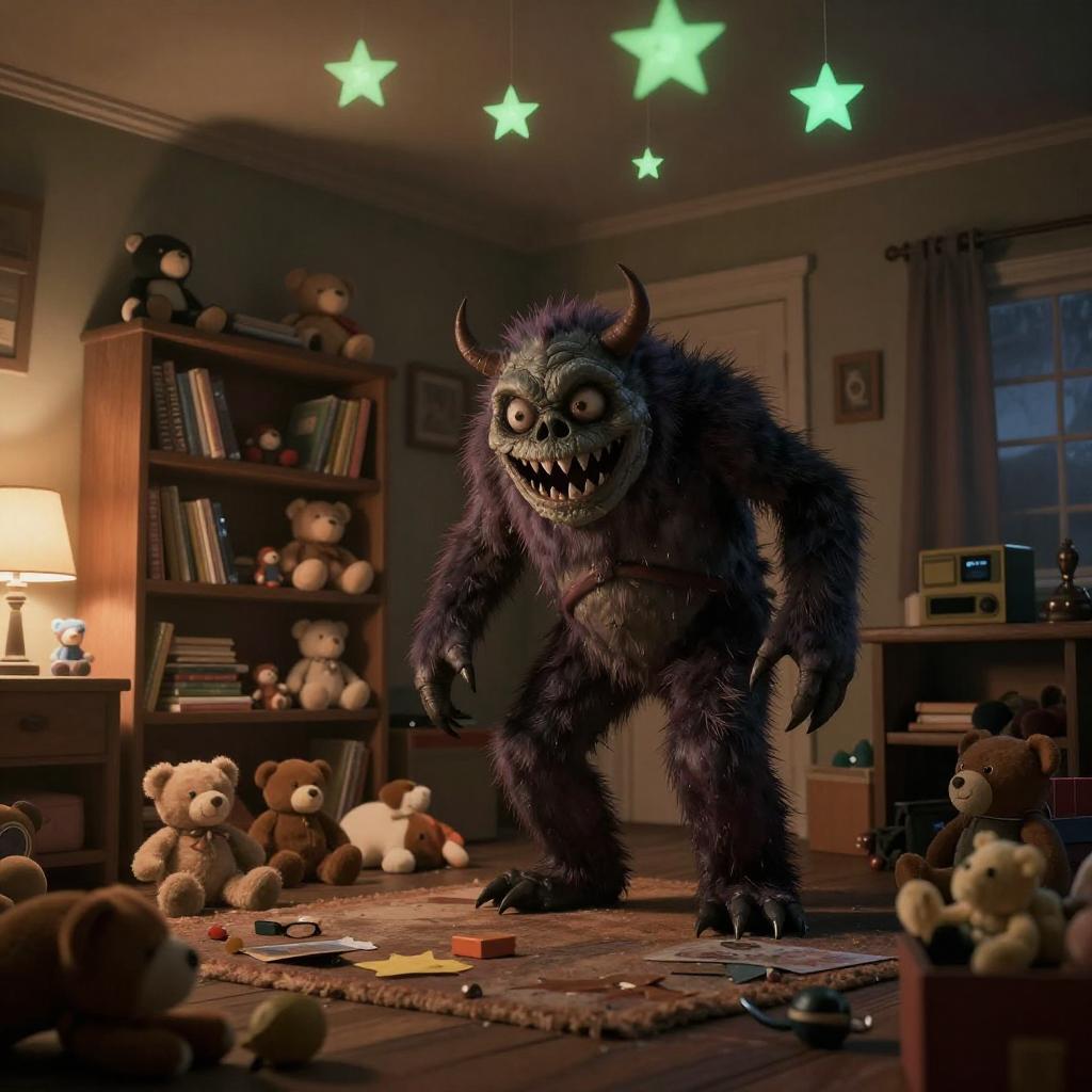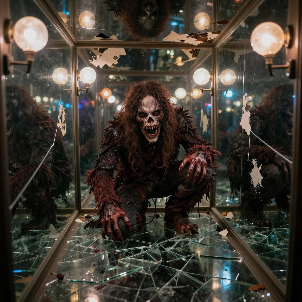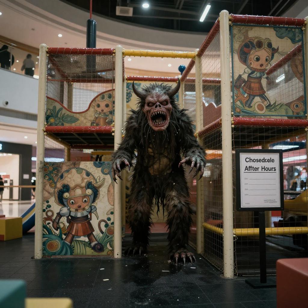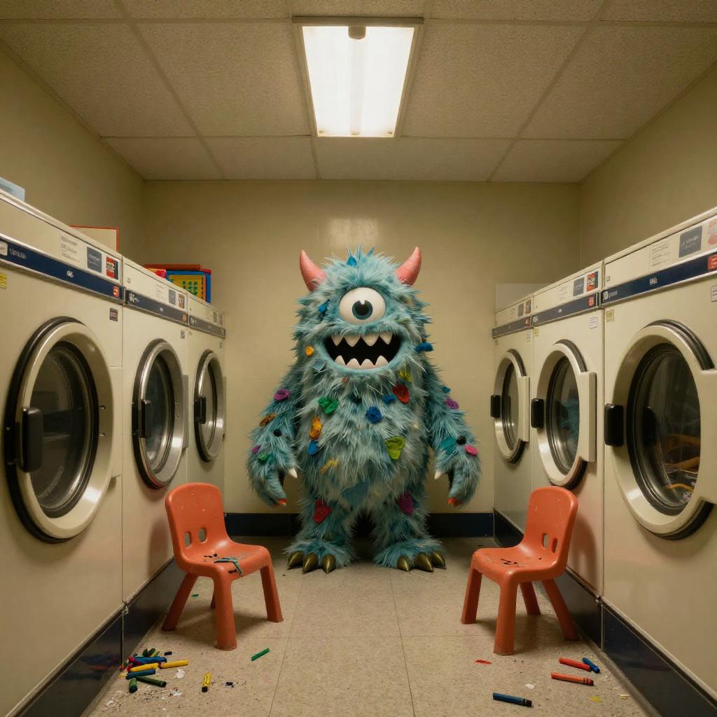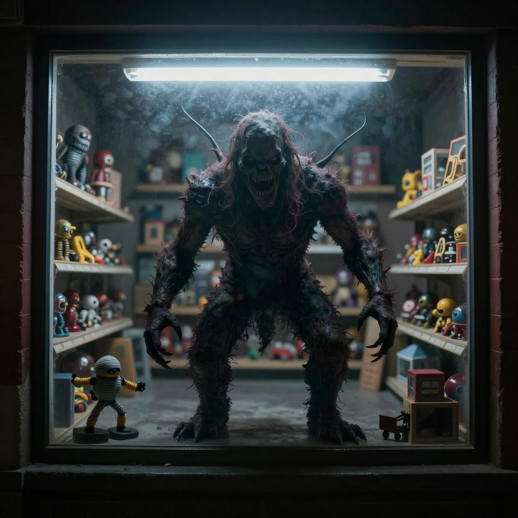 A horrifying monster lurking in storage closet beneath bleachers (stacked lost-and-found kids' jackets, damp paper trophies, forgotten sports equipment), neon lighting