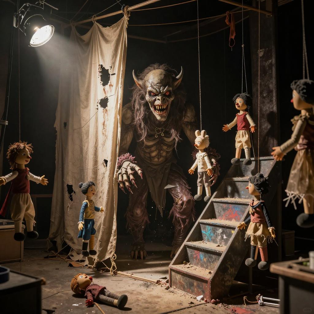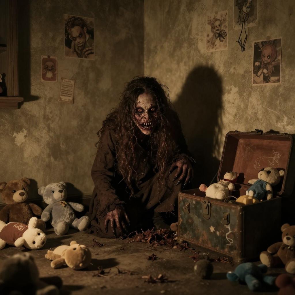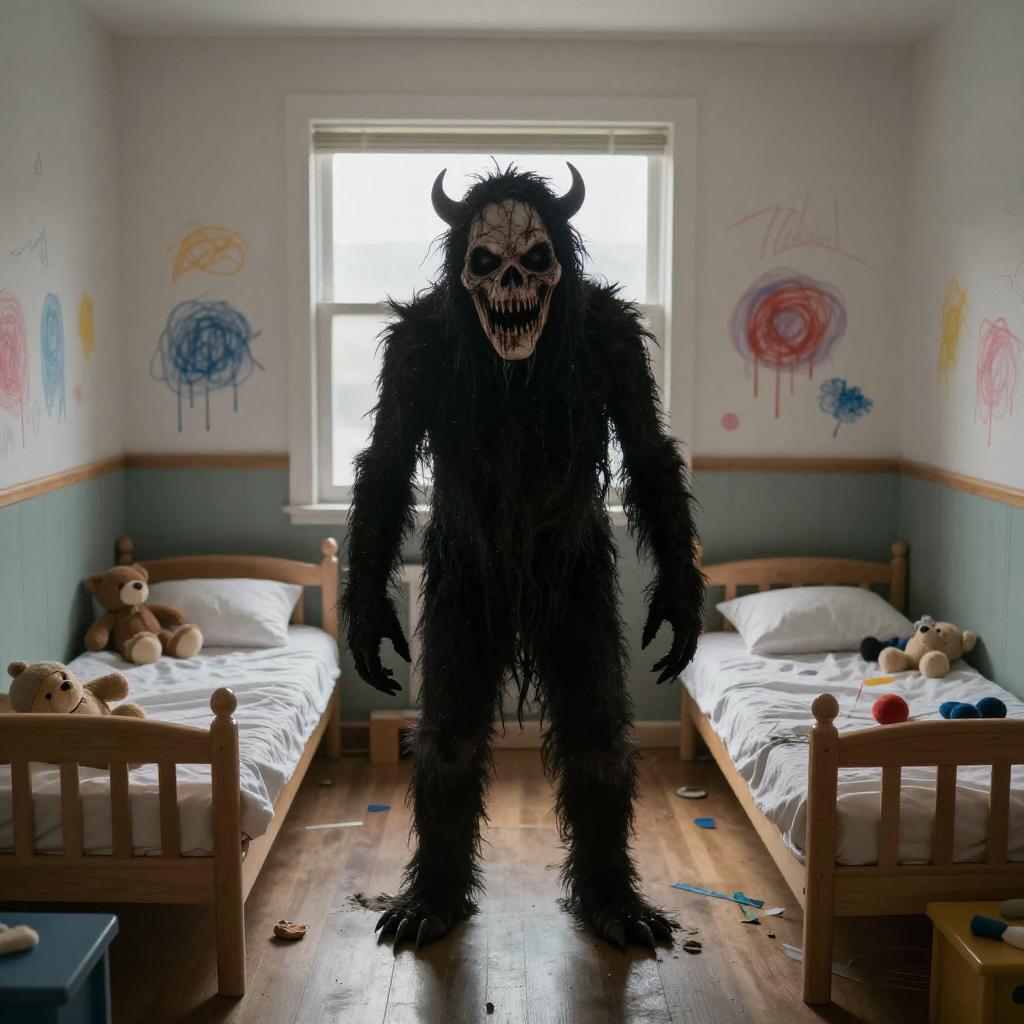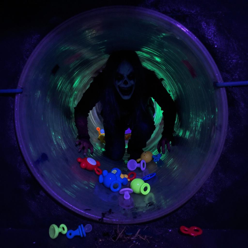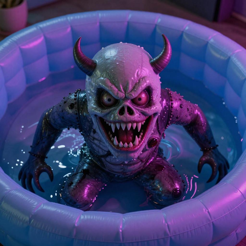 A horrifying monster lurking in storage closet beneath bleachers (stacked lost-and-found kids' jackets, damp paper trophies, forgotten sports equipment), neon lighting