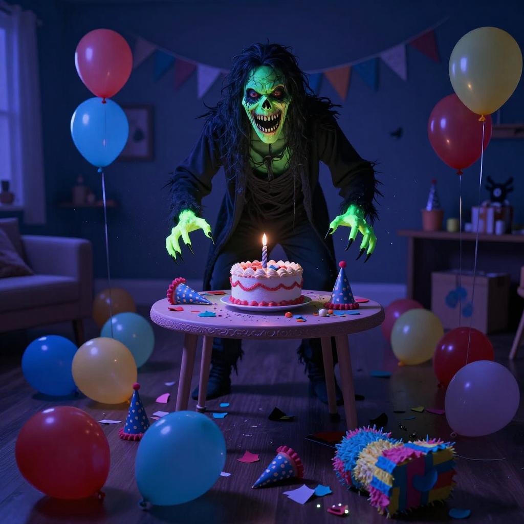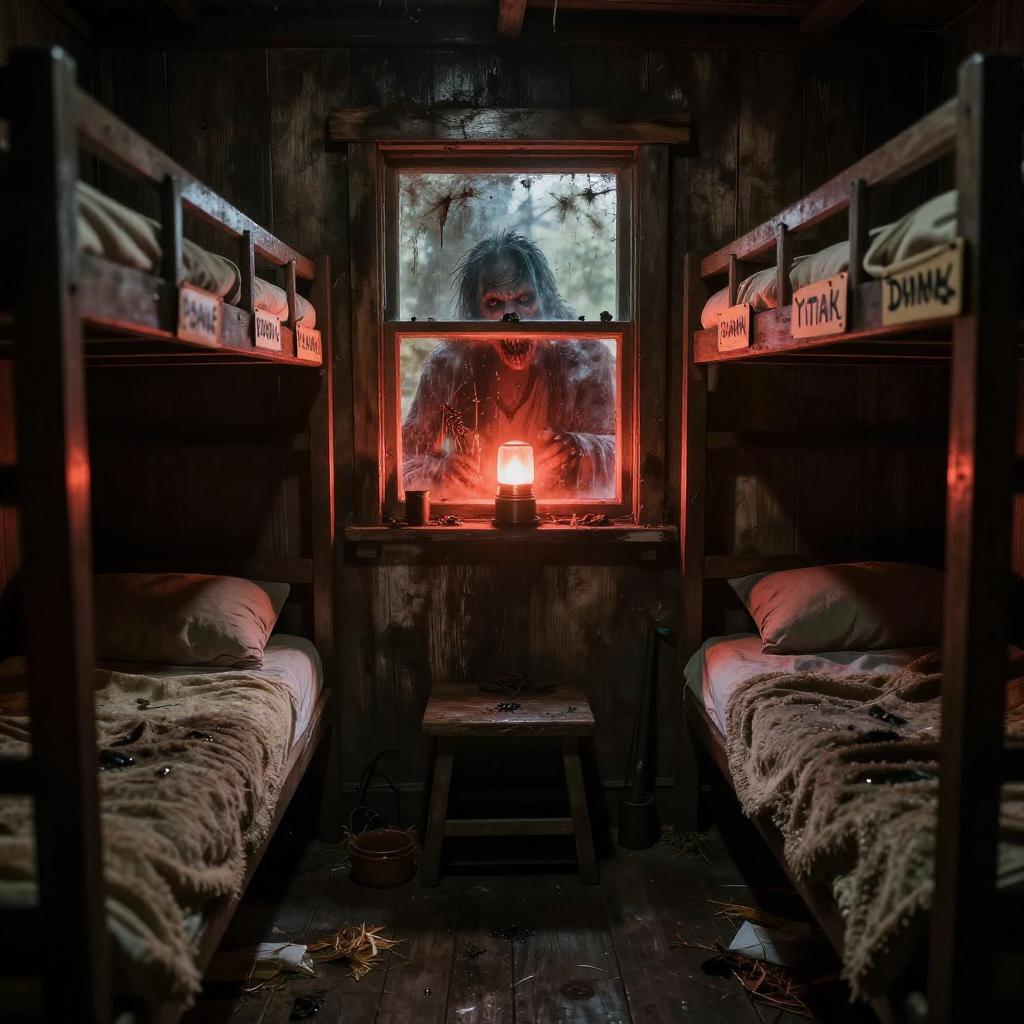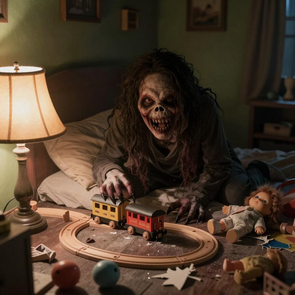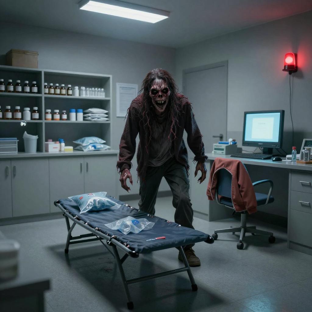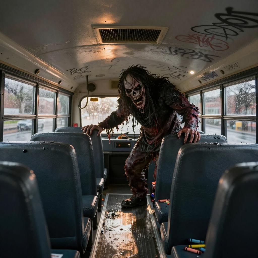 A horrifying monster lurking in storage closet beneath bleachers (stacked lost-and-found kids' jackets, damp paper trophies, forgotten sports equipment), neon lighting