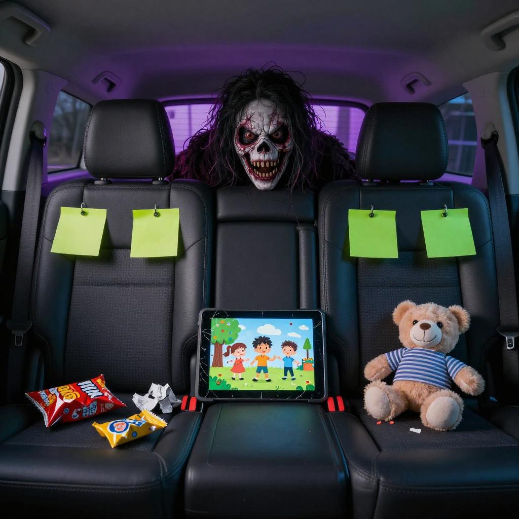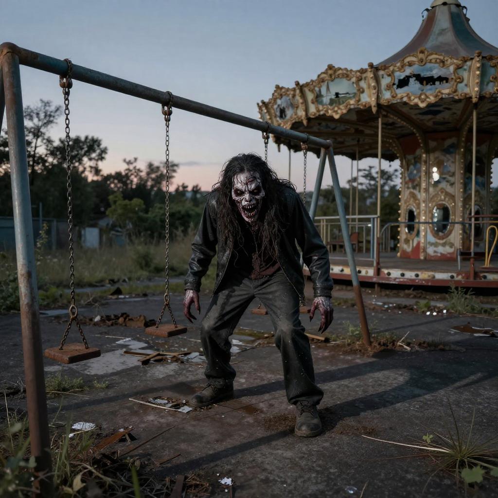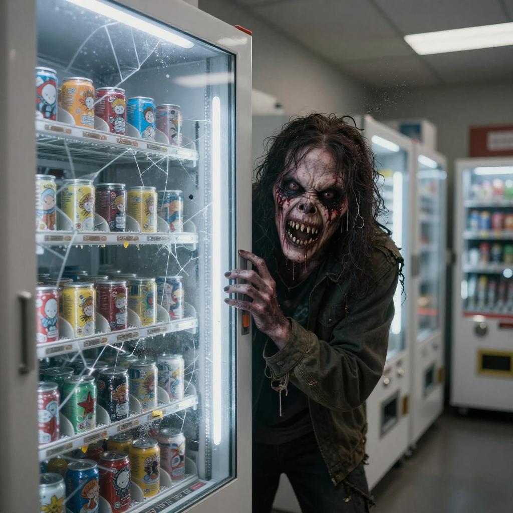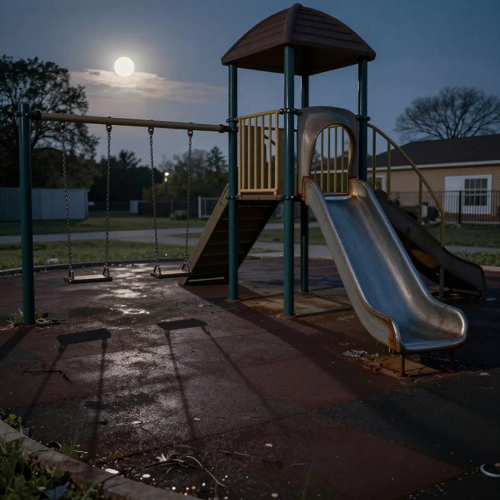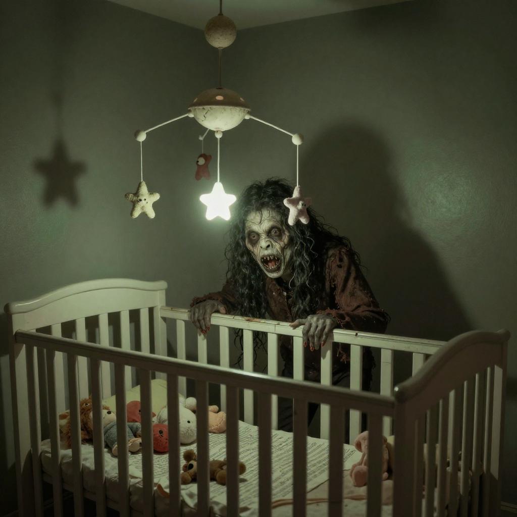 A horrifying monster lurking in storage closet beneath bleachers (stacked lost-and-found kids' jackets, damp paper trophies, forgotten sports equipment), neon lighting