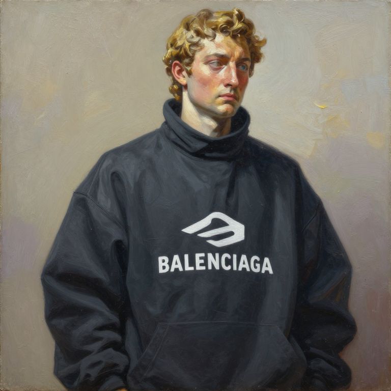 Realistic oil painting of a young man with curly blond hair, wearing a black Balenciaga hoodie, against a muted beige background.