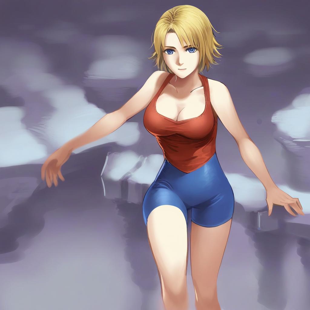 Monk (fft), final fantasy, 1girl, blue eyes, short hair, blonde hair, large breasts, cleavage, bare shoulders, unitard, unitard, by artist ruukii drift, leet